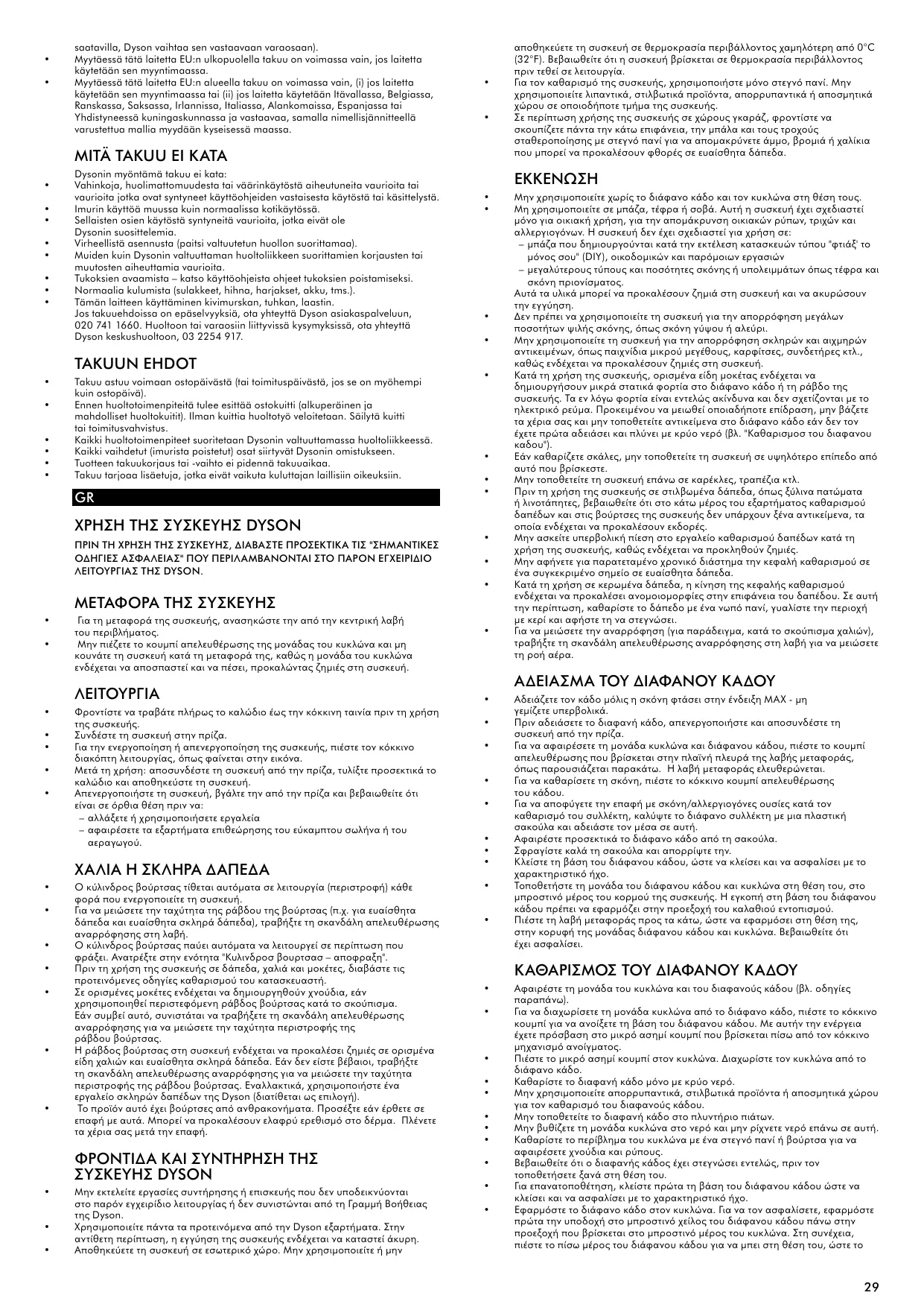 Η Dyson ή ο εξουσιοδοτημένος της αντιπρόσωπος, δεν εγγυάται την επισκευή ή αντικατάσταση της συσκευής που οφείλεται σε: Τυχαία βλάβη ή φθορά που προκλήθηκε από αμέλεια, απροσεξία, από λανθασμένο χειρισμό ή οποιαδήποτε άλλη χρήση της ηλεκτρικής σκούπας που δεν είναι συμβατή με τις οδηγίες χρήσης της Dyson. Χρήση της συσκευής για άλλο σκοπό πέραν του οικιακού καθαρισμού. Συναρμολόγηση ή εγκατάσταση εξαρτημάτων με τρόπο μη συμβατό με τις οδηγίες της Dyson. Χρήση ανταλλακτικών και αξεσουάρ που δεν ανήκουν στα Γνήσια Εξαρτήματα Dyson. Ελαττωματική εγκατάσταση (εξαιρούνται οι εγκαταστάσεις που πραγματοποιήθηκαν από την Dyson ή τον εξουσιοδοτημένο της αντιπρόσωπο). Επισκευές και μετατροπές που πραγματοποιήθηκαν από τρίτους και όχι από τη Dyson ή τους εξουσιοδοτημένους αντιπροσώπους της. Φράξιμο – δείτε περισσότερες λεπτομέρειες σχετικά με την αντιμετώπιση του φραξίματος στο βιβλίο οδηγιών χρήσης της Dyson. Φυσιολογική χρήση και φθορά (π.χ.. ηλ. ασφάλειες, ιμάντας, μπαταρίες, μπάρα βουρτσών κλπ). Η χρήση της συσκευής σε μπάζα, τέφρα, σοβά. Για τυχόν αμφιβολίες σχετικά με τις προϋποθέσεις ισχύος της εγγύησης, παρακαλούμε να επικοινωνείτε με τη Γραμμή Εξυπηρέτησης πελατών της Dyson στον αριθμό 800 111 3500 και για Κύπρο στο 24 53 2220.