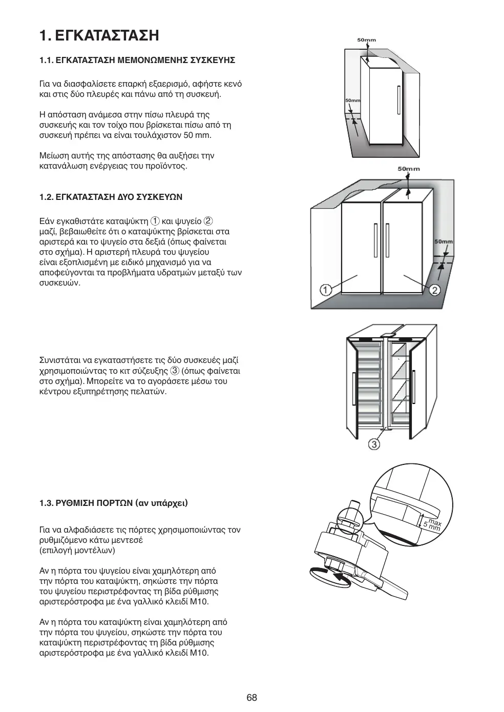 1.2. INSTALLATION DE DEUX APPAREILS Durant l'installation du congélateur 1 et du réfrigérateur 2 , assurez-vous que le congélateur est placé à gauche et le réfrigérateur à droite (comme illustré sur l'image). Sur le côté gauche du réfrigérateur se trouve un dispositif spécial permettant d'éviter les problèmes de condensation entre les appareils.