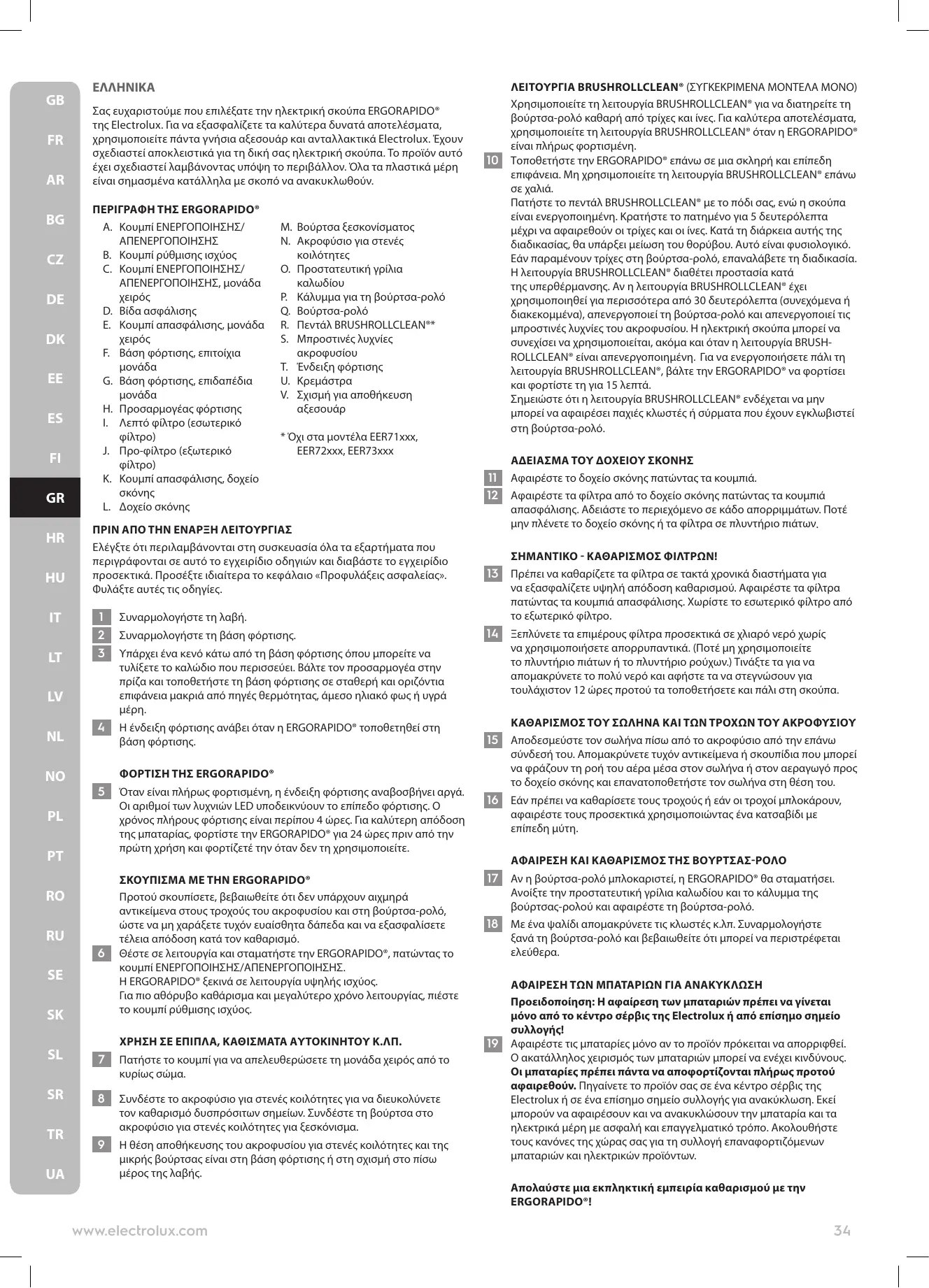 ΕΛΛΗΝΙΚΑ Σας ευχαριστούμε που επιλέξατε την ηλεκτρική σκούπα ERGORAPIDO® της Electrolux. Για να εξασφαλίζετε τα καλύτερα δυνατά αποτελέσματα, χρησιμοποιείτε πάντα γνήσια αξεσουάρ και ανταλλακτικά Electrolux. Έχουν σχεδιαστεί αποκλειστικά για τη δική σας ηλεκτρική σκούπα. Το προϊόν αυτό έχει σχεδιαστεί λαμβάνοντας υπόψη το περιβάλλον. Όλα τα πλαστικά μέρη είναι σημασμένα κατάλληλα με σκοπό να ανακυκλωθούν. ΠΕΡΙΓΡΑΦΗ ΤΗΣ ERGORAPIDO® A. Κουμπί ΕΝΕΡΓΟΠΟΙΗΣΗΣ/ ΑΠΕΝΕΡΓΟΠΟΙΗΣΗΣ Β. Κουμπί ρύθμισης ισχύος C. Κουμπί ΕΝΕΡΓΟΠΟΙΗΣΗΣ/ ΑΠΕΝΕΡΓΟΠΟΙΗΣΗΣ, μονάδα χειρός D. Βίδα ασφάλισης Ε. Κουμπί απασφάλισης, μονάδα χειρός F. Βάση φόρτισης, επιτοίχια μονάδα G. Βάση φόρτισης, επιδαπέδια μονάδα H. Προσαρμογέας φόρτισης I. Λεπτό φίλτρο (εσωτερικό φίλτρο) J. Προ-φίλτρο (εξωτερικό φίλτρο) Κ. Κουμπί απασφάλισης, δοχείο σκόνης L. Δοχείο σκόνης