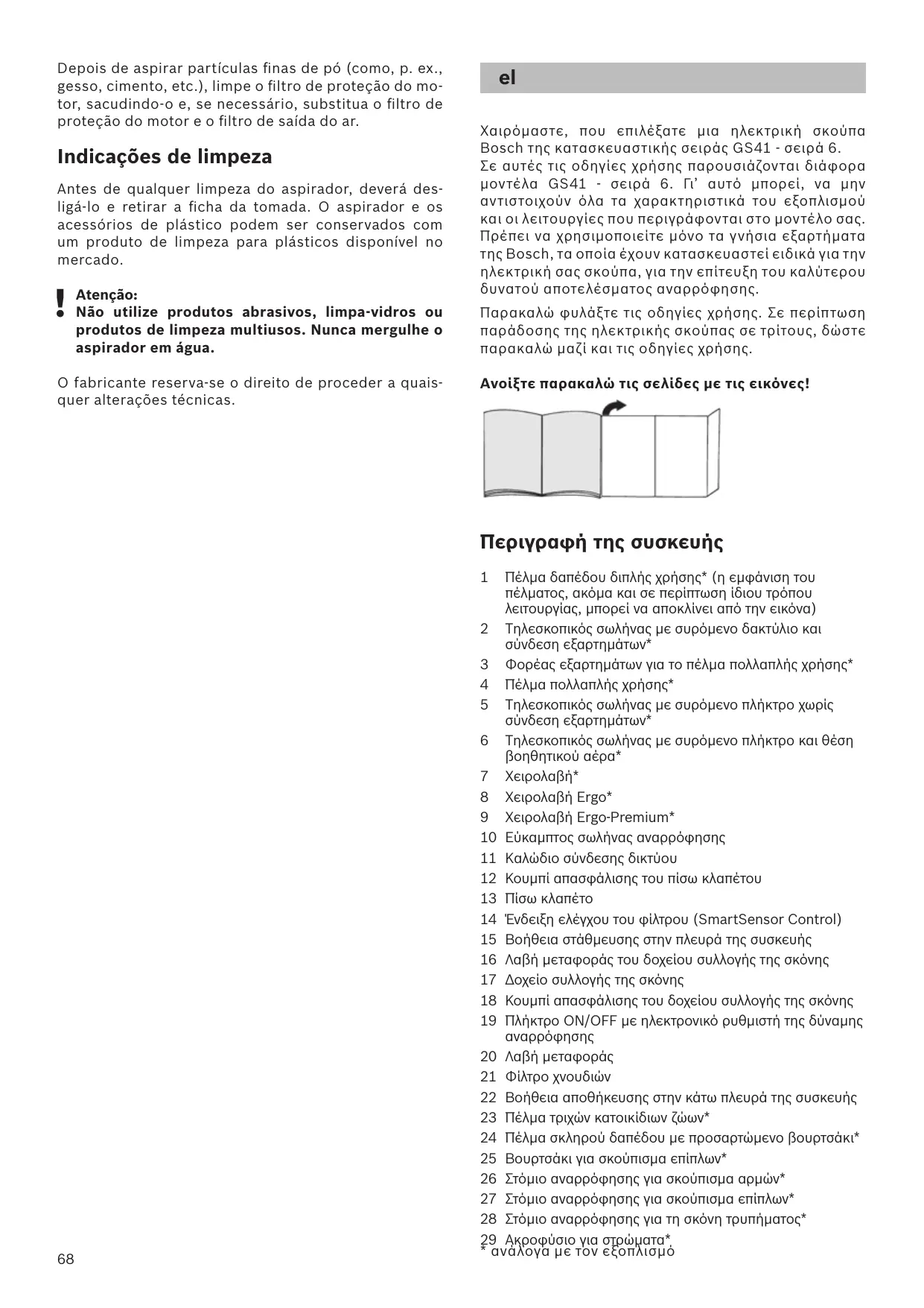 Conservare le istruzioni per l'uso. In caso di cessione dell'aspirapolvere a terzi, si raccomanda di consegnare anche le istruzioni per l'uso. Die Gebrauchsanweisung bitte aufbewahren. Bei Weitergabe des Staubsaugers an Dritte bitte Gebrauchsanweisung mitgeben. Congratulations on your purchase of a Bosch vacuum cleaner from the GS41 – Serie 6 series. This instruction manual describes various GS41 – Serie 6 models, which means that some of the equipment features and functions described may not apply to your model. You should only use genuine Bosch accessories – these have been specially developed for your vacuum cleaner to achieve the best possible vacuuming results. Please keep this instruction manual for future reference. When giving the vacuum cleaner to a third party, please also pass on this instruction manual. GS41 – Serie 6. Il se peut donc que toutes les caractéristiques et les fonctions décrites ici ne concernent pas votre aspirateur. Utilisez exclusivement les accessoires d'origine Bosch. Ils sont spécialement conçus pour votre aspirateur, pour vous permettre d'obtenir un résultat de nettoyage optimal. Conservez la présente notice d'utilisation. Si vous remettez l'aspirateur à une tierce personne, veuillez-y joindre sa notice d'utilisation. Veuillez déplier les volets illustrés !