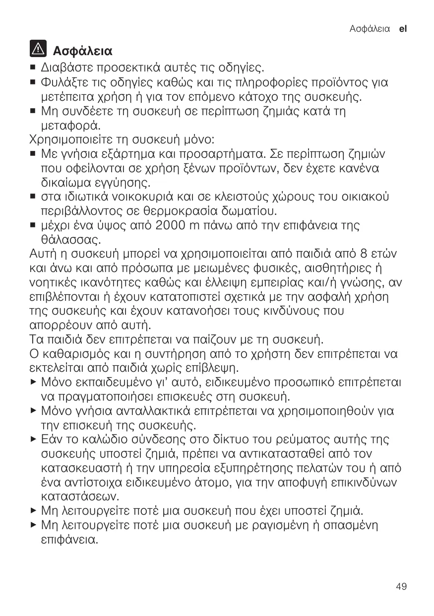 ¡ Διαβάστε προσεκτικά αυτές τις οδηγίες. ¡ Φυλάξτε τις οδηγίες καθώς και τις πληροφορίες προϊόντος για μετέπειτα χρήση ή για τον επόμενο κάτοχο της συσκευής. ¡ Μη συνδέετε τη συσκευή σε περίπτωση ζημιάς κατά τη Χρησιμοποιείτε τη συσκευή μόνο: ¡ Με γνήσια εξάρτημα και προσαρτήματα. Σε περίπτωση ζημιών που οφείλονται σε χρήση ξένων προϊόντων, δεν έχετε κανένα δικαίωμα εγγύησης. ¡ στα ιδιωτικά νοικοκυριά και σε κλειστούς χώρους του οικιακού περιβάλλοντος σε θερμοκρασία δωματίου. ¡ μέχρι ένα ύψος από 2000 m πάνω από την επιφάνεια της Αυτή η συσκευή μπορεί να χρησιμοποιείται από παιδιά από 8 ετών και άνω και από πρόσωπα με μειωμένες φυσικές, αισθητήριες ή νοητικές ικανότητες καθώς και έλλειψη εμπειρίας και/ή γνώσης, αν επιβλέπονται ή έχουν κατατοπιστεί σχετικά με την ασφαλή χρήση της συσκευής και έχουν κατανοήσει τους κινδύνους που απορρέουν από αυτή. Τα παιδιά δεν επιτρέπεται να παίζουν με τη συσκευή. Ο καθαρισμός και η συντήρηση από το χρήστη δεν επιτρέπεται να εκτελείται από παιδιά χωρίς επίβλεψη. ▶ Μόνο εκπαιδευμένο γι’ αυτό, ειδικευμένο προσωπικό επιτρέπεται να πραγματοποιήσει επισκευές στη συσκευή. ▶ Μόνο γνήσια ανταλλακτικά επιτρέπεται να χρησιμοποιηθούν για την επισκευή της συσκευής. ▶ Εάν το καλώδιο σύνδεσης στο δίκτυο του ρεύματος αυτής της συσκευής υποστεί ζημιά, πρέπει να αντικατασταθεί από τον κατασκευαστή ή την υπηρεσία εξυπηρέτησης πελατών του ή από ένα αντίστοιχα ειδικευμένο άτομο, για την αποφυγή επικινδύνων καταστάσεων. ▶ Μη λειτουργείτε ποτέ μια συσκευή που έχει υποστεί ζημιά. ▶ Μη λειτουργείτε ποτέ μια συσκευή με ραγισμένη ή σπασμένη