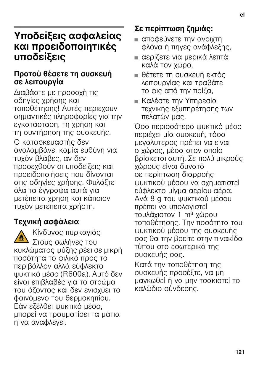 elΠίνακας περιεχομένωνelΟδηγίες χρήσηςΨυγειοκαταψύκτης Υποδείξεις ασφαλείας και προειδοποιητικές Προτού θέσετε τη συσκευή σε λειτουργία Διαβάστε με προσοχή τις οδηγίες χρήσης και τοποθέτησης! Αυτές περιέχουν σημαντικές πληροφορίες για την εγκατάσταση, τη χρήση και τη συντήρηση της συσκευής. Ο κατασκευαστής δεν αναλαμβάνει καμία ευθύνη για τυχόν βλάβες, αν δεν προσεχθούν οι υποδείξεις και προειδοποιήσεις που δίνονται στις οδηγίες χρήσης. Φυλάξτε όλα τα έγγραφα αυτά για μετέπειτα χρήση και κάποιον τυχόν μετέπειτα χρήστη. Τεχνική ασφάλεια Κίνδυνος πυρκαγιάς Στους σωλήνες του κυκλώματος ψύξης ρέει σε μικρή ποσότητα το φιλικό προς το περιβάλλον αλλά εύφλεκτο ψυκτικό μέσο (R600a). Αυτό δεν είναι επιβλαβές για το στρώμα του όζοντος και δεν ενισχύει το φαινόμενο του θερμοκηπίου. Εάν εξέλθει ψυκτικό μέσο, μπορεί να τραυματίσει τα μάτια ή να αναφλεγεί. Σε περίπτωση ζημιάς: ■ αποφεύγετε την ανοιχτή φλόγα ή πηγές ανάφλεξης, ■ αερίζετε για μερικά λεπτά καλά τον χώρο, ■ θέτετε τη συσκευή εκτός λειτουργίας και τραβάτε το φις από την πρίζα, ■ Kαλέστε την Υπηρεσία τεχνικής εξυπηρέτησης των πελατών μας. Όσο περισσότερο ψυκτικό μέσο περιέχει μία συσκευή, τόσο μεγαλύτερος πρέπει να είναι ο χώρος, μέσα στον οποίο βρίσκεται αυτή. Σε πολύ μικρούς χώρους είναι δυνατό σε περίπτωση διαρροής ψυκτικού μέσου να σχηματιστεί εύφλεκτο μίγμα αερίου-αέρα. Ανά 8 g του ψυκτικού μέσου πρέπει να υπολογιστεί τουλάχιστον 1 m³ χώρου τοποθέτησης. Την ποσότητα του ψυκτικού μέσου της συσκευής σας θα την βρείτε στην πινακίδα τύπου στο εσωτερικό της συσκευής σας. Κατά την τοποθέτηση της συσκευής προσέξτε, να μη μαγκωθεί ή να μην τσακιστεί το καλώδιο σύνδεσης.