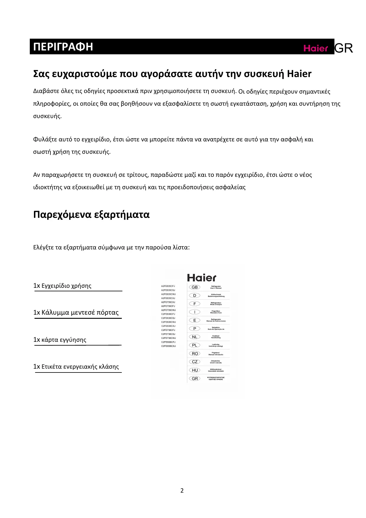 Σας ευχαριστούμε που αγοράσατε αυτήν την συσκευή Haier Διαβάστε όλες τις οδηγίες προσεκτικά πριν χρησιμοποιήσετε τη συσκευή. Οι οδηγίες περιέχουν σημαντικές πληροφορίες, οι οποίες θα σας βοηθήσουν να εξασφαλίσετε τη σωστή εγκατάσταση, χρήση και συντήρηση της Φυλάξτε αυτό το εγχειρίδιο, έτσι ώστε να μπορείτε πάντα να ανατρέχετε σε αυτό για την ασφαλή και σωστή χρήση της συσκευής. Αν παραχωρήσετε τη συσκευή σε τρίτους, παραδώστε μαζί και το παρόν εγχειρίδιο, έτσι ώστε ο νέος ιδιοκτήτης να εξοικειωθεί με τη συσκευή και τις προειδοποιήσεις ασφαλείας Παρεχόμενα εξαρτήματα Ελέγξτε τα εξαρτήματα σύμφωνα με την παρούσα λίστα: 1x Εγχειρίδιο χρήσης 1x Κάλυμμα μεντεσέ πόρτας 1x κάρτα εγγύησης 1x Ετικέτα ενεργειακής κλάσης