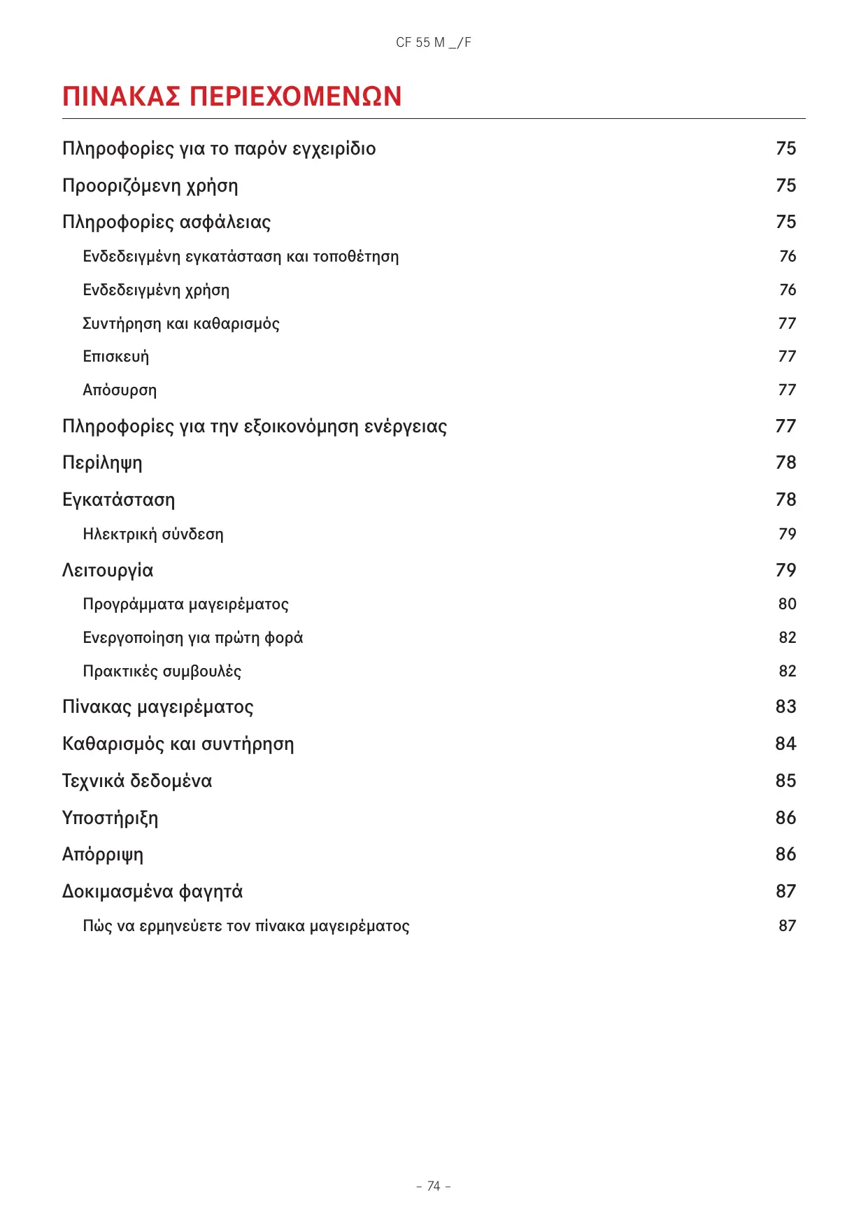 - mantenha a porta fechada durante o tempo de cozedura. ** após 10 min, vire-o. – 73 – CF 55 M _/F ΠΊΝΑΚΑΣ ΠΕΡΙΕΧΟΜΈΝΩΝ Πληροφορίες για το παρόν εγχειρίδιο