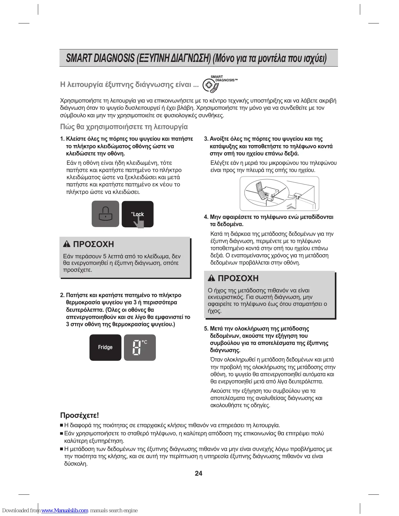 Χρησιμοποιείτε αυτή τη λειτουργία, εάν χρειάζεστε ακριβή διάγνωση από ένα Κέντρο πληροφόρησης πελατών της LG Electronics, όταν η συσκευή παρουσιάζει δυσλειτουργία ή αστοχία. Η Smart Diagnosis™ δεν μπορεί να ενεργοποιηθεί παρά μόνο εάν η συσκευή είναι συνδεδεμένη στο ρεύμα. Εάν η συσκευή δεν είναι σε θέση να ενεργοποιηθεί, τότε πρέπει να γίνει επίλυση προβλημάτων χωρίς να χρησιμοποιηθεί η Smart Diagnosis™.