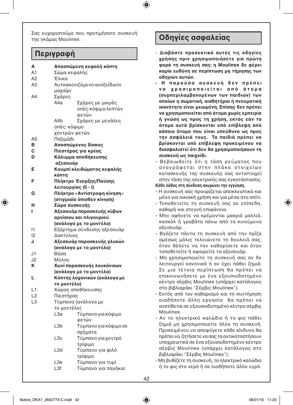 ετών A4b Σάρες µε µεγάλες πές: κψιµ ντρών ετών A5 Παιµάδι B Απσπώµενς δίσκς C Πιεστήρας για κρέας D Κάλυµµα απθήκευσης αεσυάρ E Κυµπί κλειδώµατς κεαλής κπτη F Πλήκτρ Έναρης/Παύσης λειτυργίας (0 - I) G Πλήκτρ «Αντίστρη κίνηση» (στιγµιαία πισθεν κίνηση) H Σώµα συσκευής I Αεσυάρ παρασκευής κύων αρνίσιυ και πλιγυριύ (ανάλγα µε τ µντέλ) I1 Εάρτηµα σύνδεσης αεσυάρ I2 ∆ακτύλις J Αεσυάρ παρασκευής γλυκών (ανάλγα µε τ µντέλ) J1 Βάση J2 Μύλς K ωνί παρασκευής λυκάνικων (ανάλγα µε τ µντέλ) L Κπτης λαανικών (ανάλγα µε τ µντέλ) L1 ώρς απθήκευσης L2 Πιεστήρας L3 Τύµπανα (ανάλγα µε τ µντέλ) L3a Τύµπαν για κψιµ