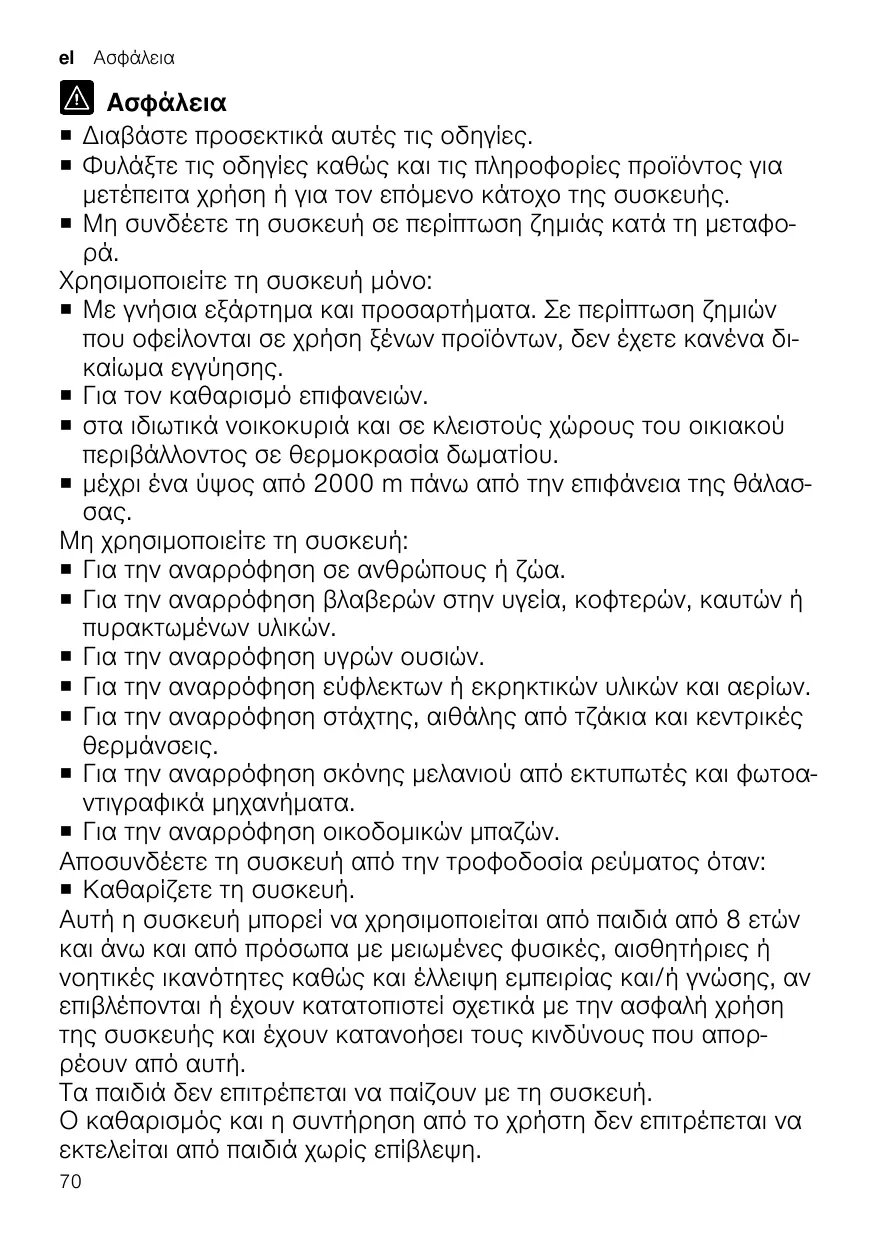 Ασφάλεια ¡ Διαβάστε προσεκτικά αυτές τις οδηγίες. ¡ Φυλάξτε τις οδηγίες καθώς και τις πληροφορίες προϊόντος για μετέπειτα χρήση ή για τον επόμενο κάτοχο της συσκευής. ¡ Μη συνδέετε τη συσκευή σε περίπτωση ζημιάς κατά τη μεταφορά. Χρησιμοποιείτε τη συσκευή μόνο: ¡ Με γνήσια εξάρτημα και προσαρτήματα. Σε περίπτωση ζημιών που οφείλονται σε χρήση ξένων προϊόντων, δεν έχετε κανένα δικαίωμα εγγύησης. ¡ Για τον καθαρισμό επιφανειών. ¡ στα ιδιωτικά νοικοκυριά και σε κλειστούς χώρους του οικιακού περιβάλλοντος σε θερμοκρασία δωματίου. ¡ μέχρι ένα ύψος από 2000 m πάνω από την επιφάνεια της θάλασσας. Μη χρησιμοποιείτε τη συσκευή: ¡ Για την αναρρόφηση σε ανθρώπους ή ζώα. ¡ Για την αναρρόφηση βλαβερών στην υγεία, κοφτερών, καυτών ή πυρακτωμένων υλικών. ¡ Για την αναρρόφηση υγρών ουσιών. ¡ Για την αναρρόφηση εύφλεκτων ή εκρηκτικών υλικών και αερίων. ¡ Για την αναρρόφηση στάχτης, αιθάλης από τζάκια και κεντρικές θερμάνσεις. ¡ Για την αναρρόφηση σκόνης μελανιού από εκτυπωτές και φωτοαντιγραφικά μηχανήματα. ¡ Για την αναρρόφηση οικοδομικών μπαζών. Αποσυνδέετε τη συσκευή από την τροφοδοσία ρεύματος όταν: ¡ Καθαρίζετε τη συσκευή. Αυτή η συσκευή μπορεί να χρησιμοποιείται από παιδιά από 8 ετών και άνω και από πρόσωπα με μειωμένες φυσικές, αισθητήριες ή νοητικές ικανότητες καθώς και έλλειψη εμπειρίας και/ή γνώσης, αν επιβλέπονται ή έχουν κατατοπιστεί σχετικά με την ασφαλή χρήση της συσκευής και έχουν κατανοήσει τους κινδύνους που απορρέουν από αυτή. Τα παιδιά δεν επιτρέπεται να παίζουν με τη συσκευή. Ο καθαρισμός και η συντήρηση από το χρήστη δεν επιτρέπεται να εκτελείται από παιδιά χωρίς επίβλεψη. 70