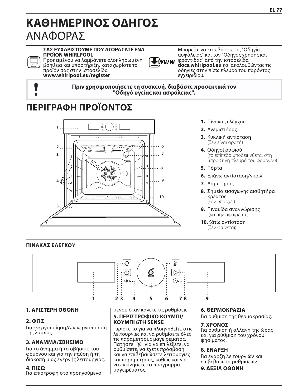 Μπορείτε να κατεβάσετε τις "Οδηγίες ασφάλειας" και τον "Οδηγός χρήσης και φροντίδας" από την ιστοσελίδα docs.whirlpool.eu και ακολουθώντας τις οδηγίες στην πίσω πλευρά του παρόντος εγχειριδίου.