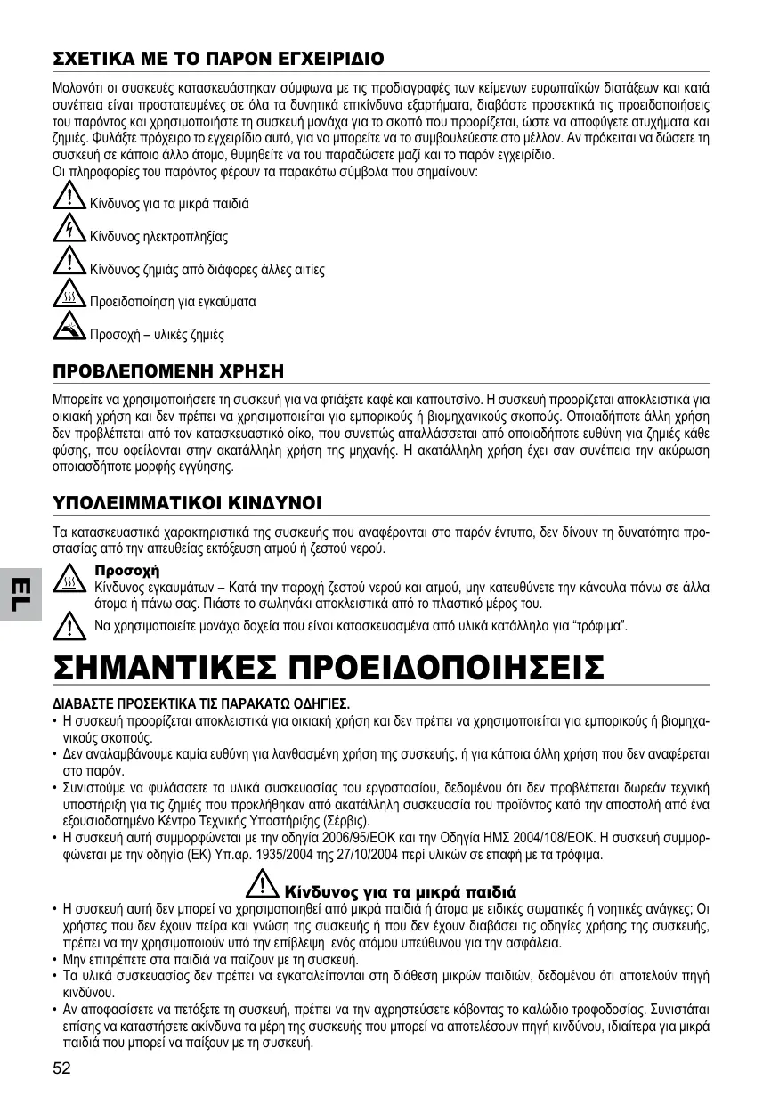 Als het apparaat niet goed werkt, zet haar dan onmiddellijk uit en trek de stekker uit het stopcontact. Σχετικά με το παρόν εγχειρίδιο Μολονότι οι συσκευές κατασκευάστηκαν σύμφωνα με τις προδιαγραφές των κείμενων ευρωπαϊκών διατάξεων και κατά συνέπεια είναι προστατευμένες σε όλα τα δυνητικά επικίνδυνα εξαρτήματα, διαβάστε προσεκτικά τις προειδοποιήσεις του παρόντος και χρησιμοποιήστε τη συσκευή μονάχα για το σκοπό που προορίζεται, ώστε να αποφύγετε ατυχήματα και ζημιές. Φυλάξτε πρόχειρο το εγχειρίδιο αυτό, για να μπορείτε να το συμβουλεύεστε στο μέλλον. Αν πρόκειται να δώσετε τη συσκευή σε κάποιο άλλο άτομο, θυμηθείτε να του παραδώσετε μαζί και το παρόν εγχειρίδιο. Οι πληροφορίες του παρόντος φέρουν τα παρακάτω σύμβολα που σημαίνουν: Κίνδυνος για τα μικρά παιδιά Κίνδυνος ηλεκτροπληξίας Κίνδυνος ζημιάς από διάφορες άλλες αιτίες Προειδοποίηση για εγκαύματα Προσοχή – υλικές ζημιές Προβλεπόμενη χρήση Μπορείτε να χρησιμοποιήσετε τη συσκευή για να φτιάξετε καφέ και καπουτσίνο. Η συσκευή προορίζεται αποκλειστικά για οικιακή χρήση και δεν πρέπει να χρησιμοποιείται για εμπορικούς ή βιομηχανικούς σκοπούς. Οποιαδήποτε άλλη χρήση δεν προβλέπεται από τον κατασκευαστικό οίκο, που συνεπώς απαλλάσσεται από οποιαδήποτε ευθύνη για ζημιές κάθε φύσης, που οφείλονται στην ακατάλληλη χρήση της μηχανής. Η ακατάλληλη χρήση έχει σαν συνέπεια την ακύρωση οποιασδήποτε μορφής εγγύησης. Υπολειμματικοί κίνδυνοι