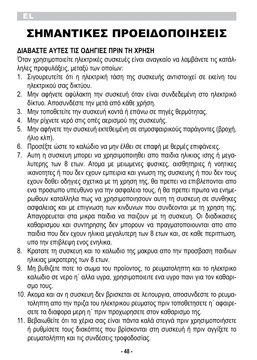 électrique; débranchez-le après chaque utilisation. 3. Ne placez pas l’appareil au dessus ou près de sources de chaleur. 4. Lors de son utilisation, placez l’appareil sur une surface horizontale et stable. 5. N’exposez jamais l’appareil aux agents atmosphériques externes (pluie, soleil, etc.). 6. Veillez à ce que le câble électrique n’entre jamais en contact avec des surfaces chaudes. 7. Cet appareil peut etre utilise par des enfants ages ou majeurs de 8 ans. Les personnes presentant des capacites physiques, sensorielles ou mentales reduites ou depourvues d’experience et de connaissance de l’appareil, ou n’ayant pas reçu les instructions necessaires devront utiliser l’appareil sous la surveillance d’une personne responsable de leur securite ou devront etre correctement instruites sur les modalites d’emploi en toute securite de cet appareil et sur les risques lies a son utilisation. Il est interdit aux enfants de jouer avec l’appareil. Les operations de nettoyage et d’entretien doivent etre effectuees par des enfants ages de plus de 8 ans et, dans tous les cas, sous la surveillance d’un adulte. 8. Garder l’appareil et son cordon d’alimentation loin de la portee des enfants ages de moins de 8 ans. 9. Ne pas plonger le corps du produit, la fiche ni le cable electrique dans l’eau ou autres liquides, et utiliser toujours un chiffon humide pour les nettoyer. 10. Meme lorsque l’appareil n’est pas en marche, debrancher la fiche de la prise de courant electrique avant d’installer ou de defaire les simples parties ou avant de proceder au nettoyage. 11. Vérifier d’avoir toujours les mains sèches avant d’utiliser ou de régler les interrupteurs placés sur l’appareil ou avant de manipuler la fiche et les connexions électriques. 12. Pour débrancher l’appareil, saisir directement la fiche en la débranchant de la prise murale. Ne tirez jamais sur le câble d’alimentation. - 12 -