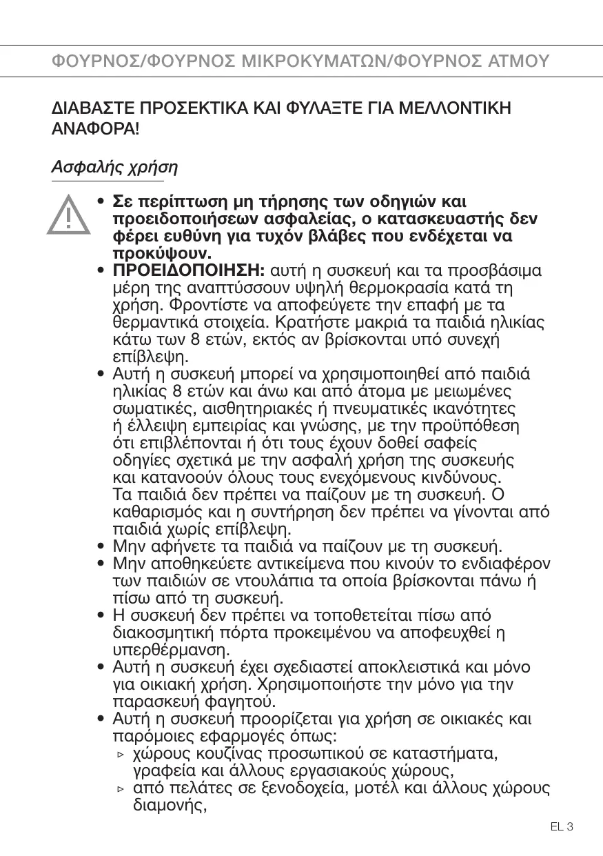 - Αυτή η συσκευή προορίζεται για χρήση σε οικιακές και παρόμοιες εφαρμογές όπως: ▷ χώρους κουζίνας προσωπικού σε καταστήματα, γραφεία και άλλους εργασιακούς χώρους, ▷ από πελάτες σε ξενοδοχεία, μοτέλ και άλλους χώρους EL 3 ΦΟΥΡΝΟΣ/ΦΟΥΡΝΟΣ ΜΙΚΡΟΚΥΜΑΤΩΝ/ΦΟΥΡΝΟΣ ΑΤΜΟΥ
