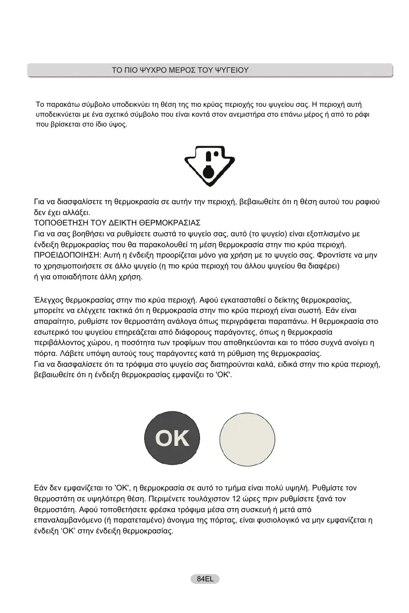Si «OK» n'apparaisse pas, la température de la zone est trop élevée. Réglez le thermostat sur une position supérieure. Attendez au mois 12 heures avant de réajuster le thermostat. Après le chargement des denrées fraîches dans l'appareil ou après les ouvertures répétées (ou ouverture prolongée) de la porte, il est normal que l'inscription «OK» n'apparaisse pas dans l'indicateur de température.