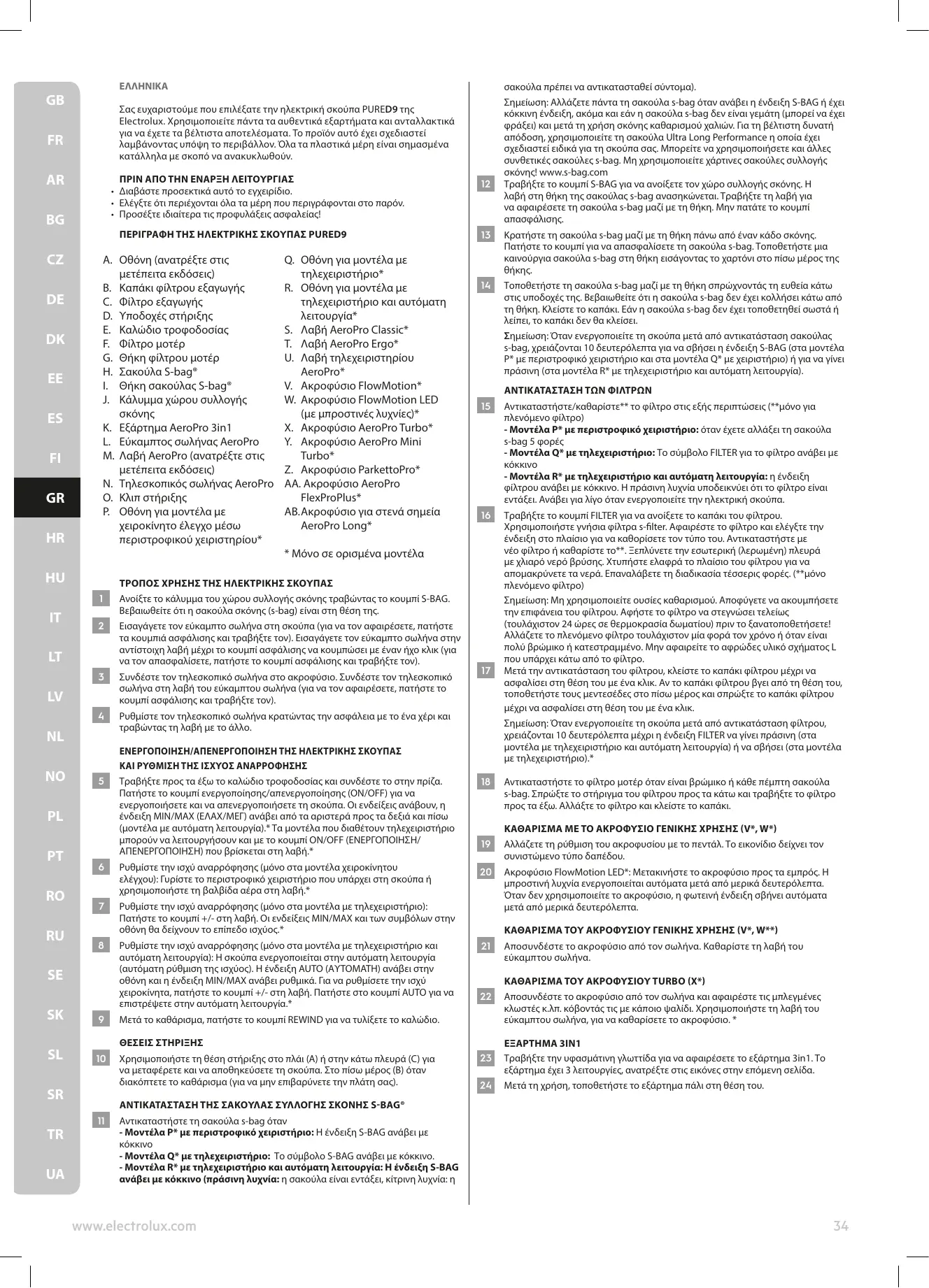 Αυτό το σύμβολο επί του προϊόντος υποδηλώνει ότι αυτό το προϊόν περιέχει μπαταρία που δεν πρέπει να απορριφθεί με τα συνήθη οικιακά απορρίμματα. Αυτό το σύμβολο επί του προϊόντος ή της συσκευασίας υποδηλώνει ότι το προϊόν δεν συγκαταλέγεται στα συνήθη οικιακά απορρίμματα. Για να ανακυκλώσετε το προϊόν σας, πηγαίνετέ το σε ένα επίσημο σημείο συλλογής ή σε ένα κέντρο σέρβις της Electrolux που μπορεί να αφαιρέσει και να ανακυκλώσει την μπαταρία και τα ηλεκτρικά μέρη με ασφαλή και επαγγελματικό τρόπο. Ακολουθήστε τους κανόνες της χώρας σας για την ξεχωριστή συλλογή ηλεκτρικών προϊόντων και επαναφορτιζόμενων Διά του παρόντος, η Electrolux Home Care and SDA δηλώνει πως η Ηλεκτρική Σκούπα με ασύρματο εξοπλισμό τύπου HER2 και HER3 συμμορφώνεται με την Οδηγία 2014/53/ΕΕ. Προφυλάξεις για το καλώδιο τροφοδοσίας Ελέγχετε τακτικά το φις και το καλώδιο. Μη χρησιμοποιείτε ποτέ την ηλεκτρική σκούπα αν το φις ή το καλώδιο έχουν υποστεί ζημιά. Η εγγύηση δεν καλύπτει φθορές του καλωδίου της ηλεκτρικής σκούπας. Ποτέ μην τραβάτε και μη σηκώνετε την ηλεκτρική σκούπα από το Η χρήση της ηλεκτρικής σκούπας στις παραπάνω περιπτώσεις μπορεί να προκαλέσει σοβαρό τραυματισμό ατόμων ή ζημιά στο προϊόν. Τέτοιου είδους τραυματισμός ή ζημιά δεν καλύπτεται από την εγγύηση ή από την Electrolux. ΣΈΡΒΙΣ ΚΑΙ ΕΓΓΎΗΣΗ Όλες οι εργασίες σέρβις ή επισκευής πρέπει να εκτελούνται από εξουσιοδοτημένο κέντρο σέρβις της Electrolux. Η εγγύηση δεν καλύπτει φθορές του καλωδίου της ηλεκτρικής σκούπας. Τυχόν βλάβη στον κινητήρα που προκλήθηκε από την αναρρόφηση υγρού, τη βύθιση της συσκευής σε υγρό ή τη χρήση της συσκευής με σωλήνα και ακροφύσιο που έχουν υποστεί ζημιά δεν καλύπτεται από την εγγύηση. Χρησιμοποιείτε πάντα αυθεντικές σακούλες σκόνης s-bag κατάλληλες για τη συγκεκριμένη ηλεκτρική σκούπα, βλ. ενότητα 11. Τυχόν βλάβες που προκαλούνται στην ηλεκτρική σκούπα από λανθασμένη χρήση μη αυθεντικών σακουλών σκόνης δεν καλύπτονται από την εγγύηση. www.electrolux.com