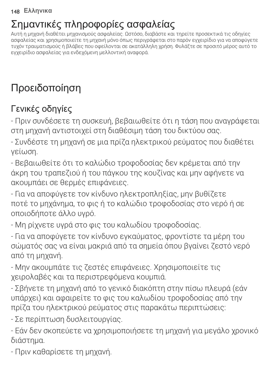 Προειδοποίηση Γενικές οδηγίες - Πριν συνδέσετε τη συσκευή, βεβαιωθείτε ότι η τάση που αναγράφεται στη μηχανή αντιστοιχεί στη διαθέσιμη τάση του δικτύου σας. - Συνδέστε τη μηχανή σε μια πρίζα ηλεκτρικού ρεύματος που διαθέτει γείωση. - Βεβαιωθείτε ότι το καλώδιο τροφοδοσίας δεν κρέμεται από την άκρη του τραπεζιού ή του πάγκου της κουζίνας και μην αφήνετε να ακουμπάει σε θερμές επιφάνειες. - Για να αποφύγετε τον κίνδυνο ηλεκτροπληξίας, μην βυθίζετε ποτέ το μηχάνημα, το φις ή το καλώδιο τροφοδοσίας στο νερό ή σε οποιοδήποτε άλλο υγρό. - Μη ρίχνετε υγρά στο φις του καλωδίου τροφοδοσίας. - Για να αποφύγετε τον κίνδυνο εγκαύματος, φροντίστε τα μέρη του σώματός σας να είναι μακριά από τα σημεία όπου βγαίνει ζεστό νερό από τη μηχανή. - Μην ακουμπάτε τις ζεστές επιφάνειες. Χρησιμοποιείτε τις χειρολαβές και τα περιστρεφόμενα κουμπιά. - Σβήνετε τη μηχανή από το γενικό διακόπτη στην πίσω πλευρά (εάν υπάρχει) και αφαιρείτε το φις του καλωδίου τροφοδοσίας από την πρίζα του ηλεκτρικού ρεύματος στις παρακάτω περιπτώσεις: - Σε περίπτωση δυσλειτουργίας. - Εάν δεν σκοπεύετε να χρησιμοποιήσετε τη μηχανή για μεγάλο χρονικό διάστημα. - Πριν καθαρίσετε τη μηχανή.