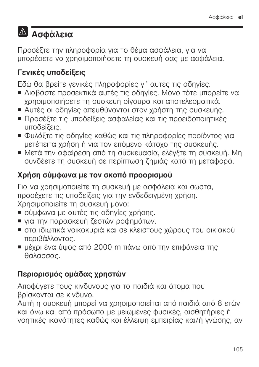 Ασφάλεια Προσέξτε την πληροφορία για το θέμα ασφάλεια, για να μπορέσετε να χρησιμοποιήσετε τη συσκευή σας με ασφάλεια. Γενικές υποδείξεις Εδώ θα βρείτε γενικές πληροφορίες γι’ αυτές τις οδηγίες. ¡ Διαβάστε προσεκτικά αυτές τις οδηγίες. Μόνο τότε μπορείτε να χρησιμοποιήσετε τη συσκευή σίγουρα και αποτελεσματικά. ¡ Αυτές οι οδηγίες απευθύνονται στον χρήστη της συσκευής. ¡ Προσέξτε τις υποδείξεις ασφαλείας και τις προειδοποιητικές υποδείξεις. ¡ Φυλάξτε τις οδηγίες καθώς και τις πληροφορίες προϊόντος για μετέπειτα χρήση ή για τον επόμενο κάτοχο της συσκευής. ¡ Μετά την αφαίρεση από τη συσκευασία, ελέγξτε τη συσκευή. Μη συνδέετε τη συσκευή σε περίπτωση ζημιάς κατά τη μεταφορά. Χρήση σύμφωνα με τον σκοπό προορισμού Για να χρησιμοποιείτε τη συσκευή με ασφάλεια και σωστά, προσέχετε τις υποδείξεις για την ενδεδειγμένη χρήση. Χρησιμοποιείτε τη συσκευή μόνο: ¡ σύμφωνα με αυτές τις οδηγίες χρήσης. ¡ για την παρασκευή ζεστών ροφημάτων. ¡ στα ιδιωτικά νοικοκυριά και σε κλειστούς χώρους του οικιακού περιβάλλοντος. ¡ μέχρι ένα ύψος από 2000 m πάνω από την επιφάνεια της θάλασσας. Περιορισμός ομάδας χρηστών Αποφύγετε τους κινδύνους για τα παιδιά και άτομα που βρίσκονται σε κίνδυνο. Αυτή η συσκευή μπορεί να χρησιμοποιείται από παιδιά από 8 ετών και άνω και από πρόσωπα με μειωμένες φυσικές, αισθητήριες ή νοητικές ικανότητες καθώς και έλλειψη εμπειρίας και/ή γνώσης, αν