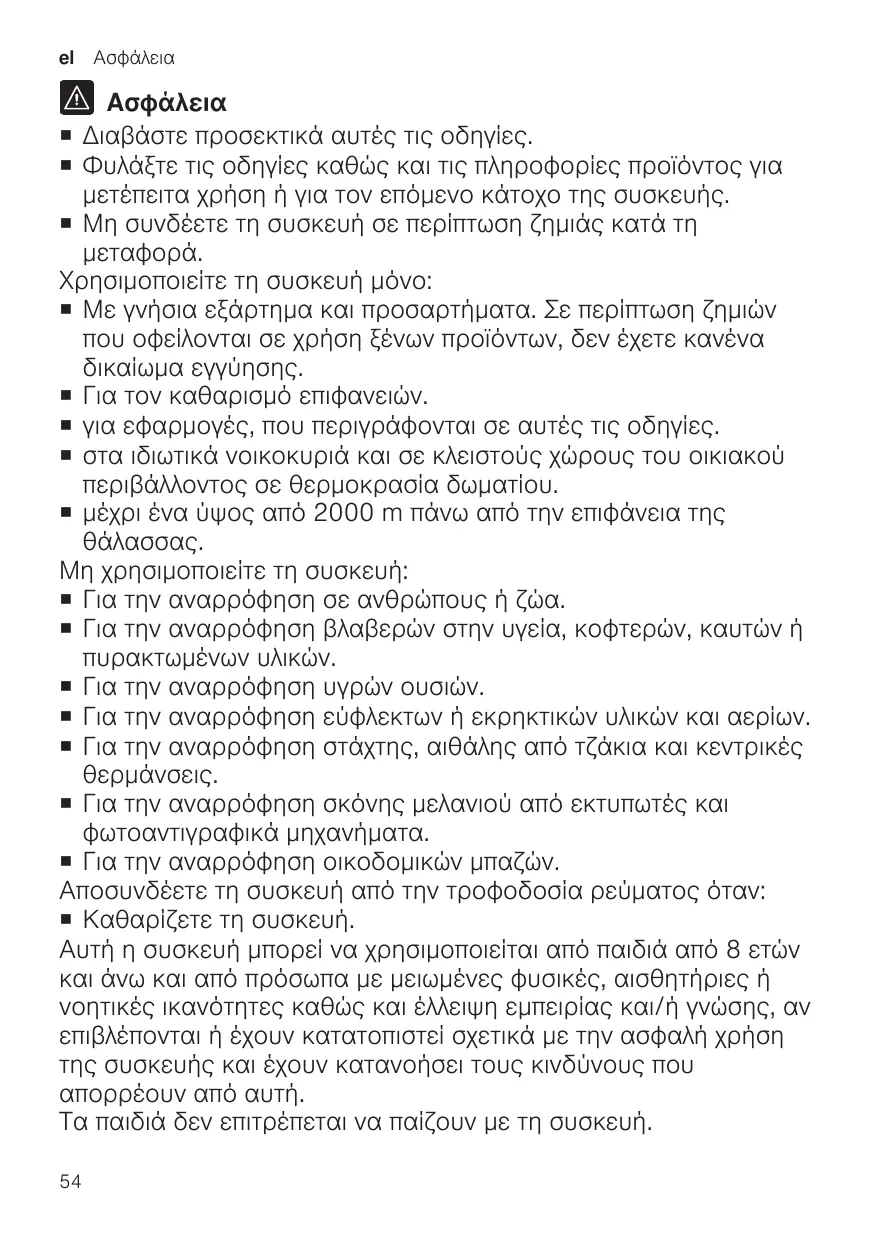 Ασφάλεια ¡ Διαβάστε προσεκτικά αυτές τις οδηγίες. ¡ Φυλάξτε τις οδηγίες καθώς και τις πληροφορίες προϊόντος για μετέπειτα χρήση ή για τον επόμενο κάτοχο της συσκευής. ¡ Μη συνδέετε τη συσκευή σε περίπτωση ζημιάς κατά τη μεταφορά. Χρησιμοποιείτε τη συσκευή μόνο: ¡ Με γνήσια εξάρτημα και προσαρτήματα. Σε περίπτωση ζημιών που οφείλονται σε χρήση ξένων προϊόντων, δεν έχετε κανένα δικαίωμα εγγύησης. ¡ Για τον καθαρισμό επιφανειών. ¡ για εφαρμογές, που περιγράφονται σε αυτές τις οδηγίες. ¡ στα ιδιωτικά νοικοκυριά και σε κλειστούς χώρους του οικιακού περιβάλλοντος σε θερμοκρασία δωματίου. ¡ μέχρι ένα ύψος από 2000 m πάνω από την επιφάνεια της θάλασσας. Μη χρησιμοποιείτε τη συσκευή: ¡ Για την αναρρόφηση σε ανθρώπους ή ζώα. ¡ Για την αναρρόφηση βλαβερών στην υγεία, κοφτερών, καυτών ή πυρακτωμένων υλικών. ¡ Για την αναρρόφηση υγρών ουσιών. ¡ Για την αναρρόφηση εύφλεκτων ή εκρηκτικών υλικών και αερίων. ¡ Για την αναρρόφηση στάχτης, αιθάλης από τζάκια και κεντρικές θερμάνσεις. ¡ Για την αναρρόφηση σκόνης μελανιού από εκτυπωτές και φωτοαντιγραφικά μηχανήματα. ¡ Για την αναρρόφηση οικοδομικών μπαζών. Αποσυνδέετε τη συσκευή από την τροφοδοσία ρεύματος όταν: ¡ Καθαρίζετε τη συσκευή. Αυτή η συσκευή μπορεί να χρησιμοποιείται από παιδιά από 8 ετών και άνω και από πρόσωπα με μειωμένες φυσικές, αισθητήριες ή νοητικές ικανότητες καθώς και έλλειψη εμπειρίας και/ή γνώσης, αν επιβλέπονται ή έχουν κατατοπιστεί σχετικά με την ασφαλή χρήση της συσκευής και έχουν κατανοήσει τους κινδύνους που απορρέουν από αυτή. Τα παιδιά δεν επιτρέπεται να παίζουν με τη συσκευή. 54