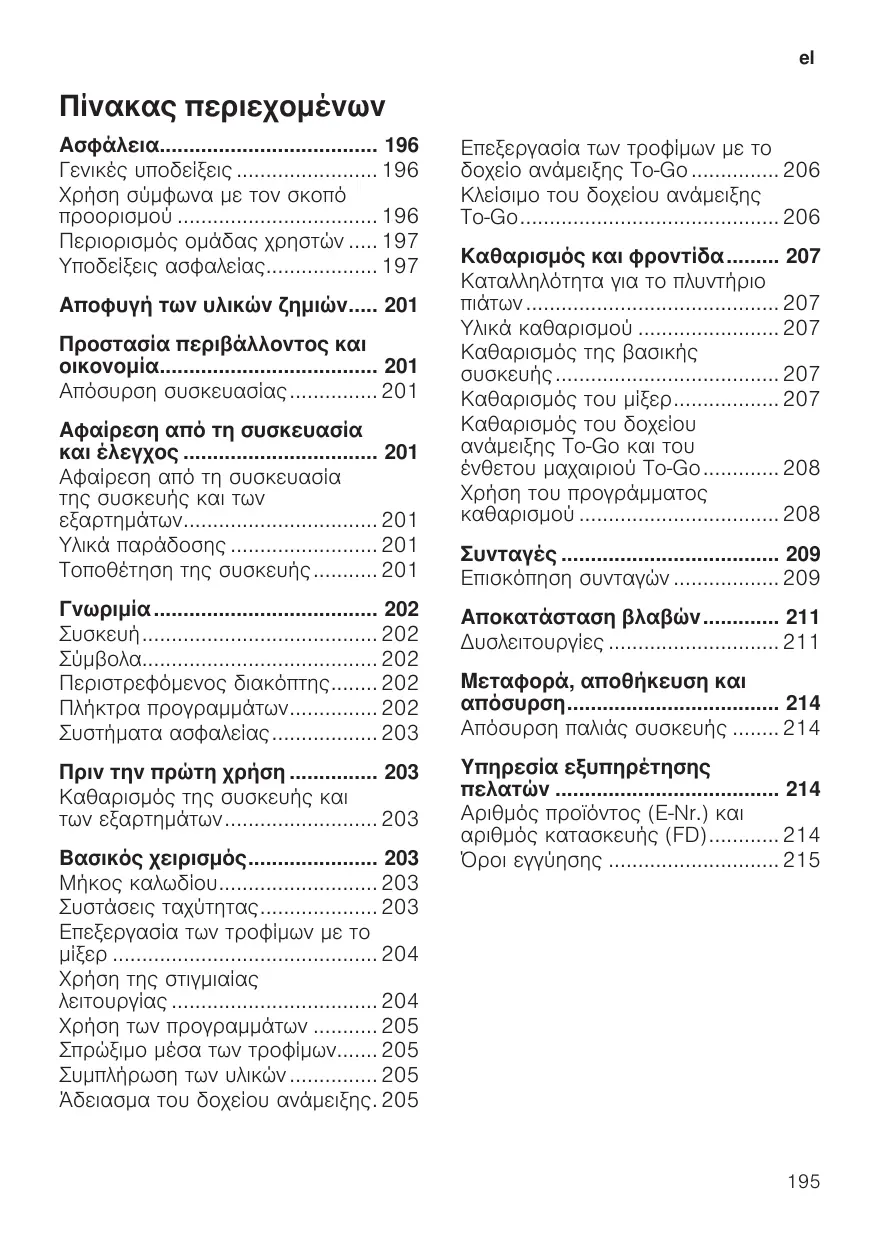 Επεξεργασία των τροφίμων με το δοχείο ανάμειξης To-Go 206 Κλείσιμο του δοχείου ανάμειξης To-Go 206 Καθαρισμός και φροντίδα 207 Καταλληλότητα για το πλυντήριο πιάτων 207 Υλικά καθαρισμού 207 Καθαρισμός της βασικής συσκευής 207 Καθαρισμός του μίξερ 207 Καθαρισμός του δοχείου ανάμειξης To-Go και του ένθετου μαχαιριού To-Go 208 Χρήση του προγράμματος καθαρισμού 208 Συνταγές 209 Επισκόπηση συνταγών 209