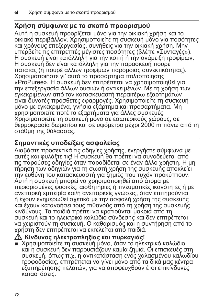 Αυτή η συσκευή προορίζεται μόνο για την οικιακή χρήση και το οικιακό περιβάλλον. Χρησιμοποιείτε τη συσκευή μόνο για ποσότητες και χρόνους επεξεργασίας, συνήθεις για την οικιακή χρήση. Μην υπερβείτε τις επιτρεπτές μέγιστες ποσότητες (βλέπε «Συνταγές»). Η συσκευή είναι κατάλληλη για την κοπή ή την ανάμειξη τροφίμων. Η συσκευή δεν είναι κατάλληλη για την παρασκευή πουρέ πατάτας (ή πουρέ άλλων τροφίμων παρόμοιας συνεκτικότητας). Χρησιμοποιήστε γι’ αυτό το προσάρτημα πολτοποίησης «ProPuree». Η συσκευή δεν επιτρέπεται να χρησιμοποιηθεί για την επεξεργασία άλλων ουσιών ή αντικειμένων. Με τη χρήση των εγκεκριμένων από τον κατασκευαστή περαιτέρω εξαρτημάτων είναι δυνατές πρόσθετες εφαρμογές. Χρησιμοποιείτε τη συσκευή μόνο με εγκεκριμένα, γνήσια εξάρτημα και προσαρτήματα. Μη χρησιμοποιείτε ποτέ τα εξαρτήματα για άλλες συσκευές. Χρησιμοποιείτε τη συσκευή μόνο σε εσωτερικούς χώρους, σε θερμοκρασία δωματίου και σε υψόμετρο μέχρι 2000 m πάνω από τη στάθμη της θάλασσας.