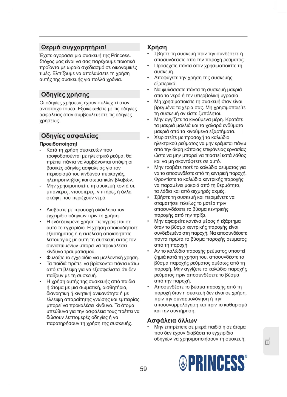 Έχετε αγοράσει μια συσκευή της Princess. Στόχος μας είναι να σας παρέχουμε ποιοτικά προϊόντα με ωραίο σχεδιασμό σε οικονομικές τιμές. Ελπίζουμε να απολαύσετε τη χρήση αυτής της συσκευής για πολλά χρόνια.