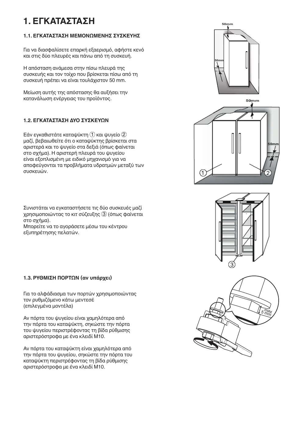 1.2. INSTALLATION DE DEUX APPAREILS Durant l'installation du congélateur 1 et du réfrigérateur 2 , assurez-vous que le congélateur est placé à gauche et le réfrigérateur à droite (comme illustré sur l'image). Sur le côté gauche du réfrigérateur se trouve un dispositif spécial permettant d'éviter les problèmes de condensation entre les appareils.