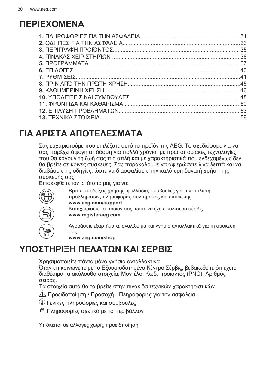 ΓΙΑ ΑΡΙΣΤΑ ΑΠΟΤΕΛΕΣΜΑΤΑ Σας ευχαριστούμε που επιλέξατε αυτό το προϊόν της AEG. Το σχεδιάσαμε για να σας παρέχει άψογη απόδοση για πολλά χρόνια, με πρωτοποριακές τεχνολογίες που θα κάνουν τη ζωή σας πιο απλή και με χαρακτηριστικά που ενδεχομένως δεν θα βρείτε σε κοινές συσκευές. Σας παρακαλούμε να αφιερώσετε λίγα λεπτά και να διαβάσετε τις οδηγίες, ώστε να διασφαλίσετε την καλύτερη δυνατή χρήση της συσκευής σας. Επισκεφθείτε τον ιστότοπό μας για να: Βρείτε υποδείξεις χρήσης, φυλλάδια, συμβουλές για την επίλυση προβλημάτων, πληροφορίες συντήρησης και επισκευής: www.aeg.com/support Καταχωρίσετε το προϊόν σας, ώστε να έχετε καλύτερο σέρβις: www.registeraeg.com Αγοράσετε εξαρτήματα, αναλώσιμα και γνήσια ανταλλακτικά για τη συσκευή www.aeg.com/shop ΥΠΟΣΤΗΡΙΞΗ ΠΕΛΑΤΩΝ ΚΑΙ ΣΕΡΒΙΣ Χρησιμοποιείτε πάντα μόνο γνήσια ανταλλακτικά. Όταν επικοινωνείτε με το Εξουσιοδοτημένο Κέντρο Σέρβις, βεβαιωθείτε ότι έχετε διαθέσιμα τα ακόλουθα στοιχεία: Μοντέλο, Κωδ. προϊόντος (PNC), Αριθμός Τα στοιχεία αυτά θα τα βρείτε στην πινακίδα τεχνικών χαρακτηριστικών. Προειδοποίηση / Προσοχή - Πληροφορίες για την ασφάλεια Γενικές πληροφορίες και συμβουλές Πληροφορίες σχετικά με το περιβάλλον Υπόκειται αε αλλαγές χωρίς προειδποίηση.