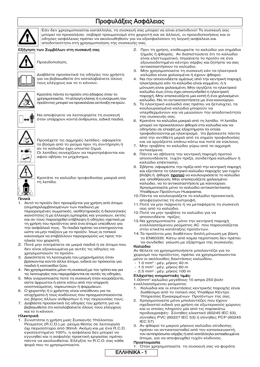 και εξετάστε το ηλεκτρικό καλώδιο παροχής για τυχόν βλάβη ή φθορά προτού να κουλουριάσετε το καλώδιο για αποθήκευση. Μην επισκευάζετε χαλασµένο καλώδιο, να το αντικαταστήσετε µε καινούργιο. Χρησιµοποιείτε µόνο το καλώδιο αντικατάστασης Υπαίθριων Προϊόντων Husqvarna. 10.Πάντα να κουλουριάζετε το καλώδιο προσεκτικά, αποφεύγοντας τη συστροφή. 11.Ποτέ να µην παίρνετε ή να µεταφέρετε τη συσκευή σας από το καλώδιο. 12.Ποτέ να µην τραβάτε το καλώδιο για να αποσυνδέετε πρίζες. 13.Να χρησιµοποιείτε µόνο την κεντρική παροχή εναλλασσόµενου ρεύµατος AC που παρουσιάζεται στην ετικέτα κατάταξης προϊόντων. 14.Τα προϊόντα µας διαθέτουν διπλή µόνωση µε βάση το EN60335. Κάτω από καµία περίσταση δεν πρέπει να συνδεθεί γείωση µε εξάρτηµα της συσκευής. Αν θέλετε να χρησιμοποιήσετε μπαλαντέζα για το χειρισμό του προϊόντος, πρέπει να χρησιμοποιούνται μόνο οι ακόλουθες διαστάσεις καλωδίου. - 1.0 mm2 : μέγ. μήκος 40 m - 1.5 mm2 : μέγ. μήκος 60 m - 2.5 mm2 : μέγ. μήκος 100 m Ελάχιστες ονομαστικές τιμές: 1.00mm2 καλώδιο µεγέθους 10 amps 250 βολτ εναλλασσόµενου ρεύµατος