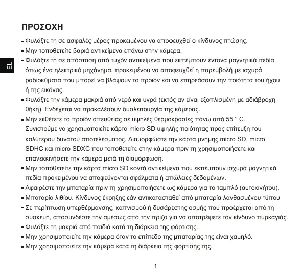 * Tempo di ricarica: 3,5 ore. * 2 batterie 3.7V 1050mAh incluse. Batería de iones de litio; peligro de explosión en caso de que se sustituya por una pila de tipo incorrecto. Retire la batería antes de utilizarla como dash cam (cámara de salpicadero). Manténgase fuera del alcance de los niños durante la carga. En caso de sobrecalentamiento, humo inesperado u olor desagradable del dispositivo, desenchúfelo inmediatamente de la toma de corriente para evitar incendios peligrosos. No utilice la cámara cuando esté casi descargada. No utilice la cámara mientras se está cargando. Guarde el aparato en un lugar fresco, seco y sin polvo. No intente abrir la carcasa de la cámara ni modificarla de ninguna manera; de lo contrario, perderá la garantía. 1