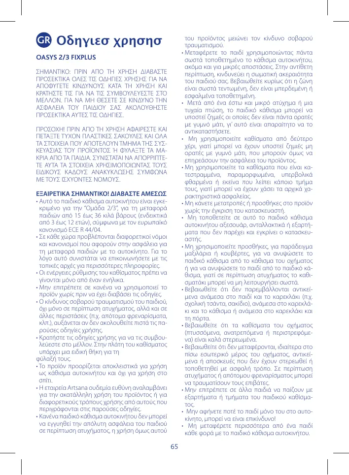 LIRE ATTENTIVEMENT ET ENTIÈREMENT CETTE NOTICE POUR ÉVITER TOUT DANGER ET LA CONSERVER POUR TOUTE RÉFÉRENCE FUTURE. POUR NE PAS COMPROMETTRE LA SÉCURITÉ DE VOTRE ENFANT, SUIVEZ ATTENTIVEMENT CES INSTRUCTIONS. ATTENTION ! AVANT D’UTILISER LE PRODUIT, ÔTER ET ÉLIMINER TOUS LES SACHETS EN PLASTIQUE ÉVENTUELS ET TOUS LES ÉLÉMENTS COMPOSANT L’EMBALLAGE DU PRODUIT ET LES TENIR HORS DE PORTÉE DES ENFANTS. IL EST CONSEILLÉ D’ÉLIMINER CES ÉLÉMENTS EN FAISANT LE TRI SÉLECTIF CONFORMÉMENT AUX LOIS EN VIGUEUR. TRÈS IMPORTANT ! À LIRE IMMÉDIATEMENT • Ce siège-auto est homologué “Groupe 2/3”, pour le transport d’enfants de 15 à 36 Kg (de 3 à 12 ans de façon indicative), conformément au règlement européen ECE R 44/04. • Chaque pays applique des lois et des règlements différents en matière de sécurité pour le transport des enfants en voiture. C’est pourquoi il est conseillé de contacter les autorités locales pour obtenir davantage d’informations. • Les activités de réglage du siège-auto doivent être effectuées exclusivement par un adulte. • Éviter que quiconque utilise le produit sans avoir lu la notice. • Le risque de blessures de l’enfant, non seulement en cas d’accident mais aussi dans d’autres circonstances (par ex. freinages brusques, etc.) augmente si les indications de cette notice ne sont pas suivies scrupuleusement. • Conserver la Notice pour toute référence future : une poche permettant de ranger la notice se trouve derrière le dossier du siège auto. • Le produit doit être utilisé exclusivement comme siège-auto et ne doit pas être utilisé à la maison. • La société Artsana décline toute responsabilité en cas d’utilisation incorrecte du produit et pour toute utilisation différente de cette notice. • Aucun siège-auto ne peut garantir la sécurité totale de l’enfant en cas d’accident, mais son utilisation réduit le risque de blessures graves. • Transporter un enfant dans un siège-auto correctement installé, même lors de trajets brefs ; dans le cas contraire, cela pourrait nuire à sa sécurité. Vérifier notamment que la ceinture est correcte-