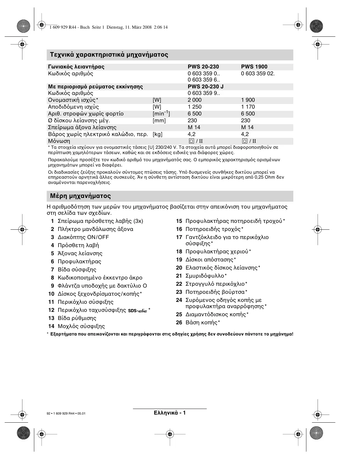 - Tα στοιχεία ισχύουν για ονοµαστικές τάσεις [U] 230/240 V. Τα στοιχεία αυτά µπορεί διαφοροποιηθούν σε περίπτωση χαµηλ τερων τάσεων, καθώς και σε εκδ σεις ειδικές για διάφορες χώρες. Παρακαλούµε προσέξτε τον κωδικ αριθµ του µηχανήµατ ς σας. Ο εµπορικ ς χαρακτηρισµ ς ορισµένων µηχανηµάτων µπορεί να διαφέρει. Οι διαδικασίες ζεύξης προκαλούν σύντοµες πτώσεις τάσης. Υπ δυσµενείς συνθήκες δικτύου µπορεί να επηρεαστούν αρνητικά άλλες συσκευές. Άν η σύνθετη αντίσταση δικτύου είναι µικρ τερη απ 0,25 Ohm δεν αναµένονται παρενοχλήσεις. Μέρη µηχανήµατος Η αριθµοδ τηση των µερών του µηχανήµατος βασίζεται στην απεικ νιση του µηχανήµατος στη σελίδα των σχεδίων. 1 Σπείρωµα πρ σθετης λαβής (3x) 15 Προφυλακτήρας ποτηροειδή τροχού * 2 Πλήκτρο µανδάλωσης άξονα 16 Ποτηροειδής τροχ ς * 3 ∆ιακ πτης ΟΝ/ΟFF 17 Γαντζ κλειδο για το περικ χλιο 4 Πρ σθετη λαβή Προφυλακτήρας χεριού * 5 Άξονας λείανσης ∆ίσκοι απ στασης * 6 Προφυλακτήρας Ελαστικ ς δίσκος λείανσης * 7 Βίδα σύσφιξης 21 Σµυριδ φυλλο* 8 Κωδικοποιηµένο έκκεντρο άκρο 22 Στρογγυλ περικ χλιο * 9 Φλάντζα υποδοχής µε δακτύλιο O 23 Ποτηροειδής βούρτσα * 10 ∆ίσκος ξεχονδρίσµατος /κοπής* 24 Συρ µενος οδηγ ς κοπής µε 11 Περικ χλιο σύσφιξης προφυλακτήρα αναρρ φησης * 12 Περικ χλιο ταχυσύσφιξης 25 ∆ιαµαντ δισκος κοπής * 13 Βίδα ρύθµισης 26 Βάση κοπής* 14 Μοχλ ς σύσφιξης