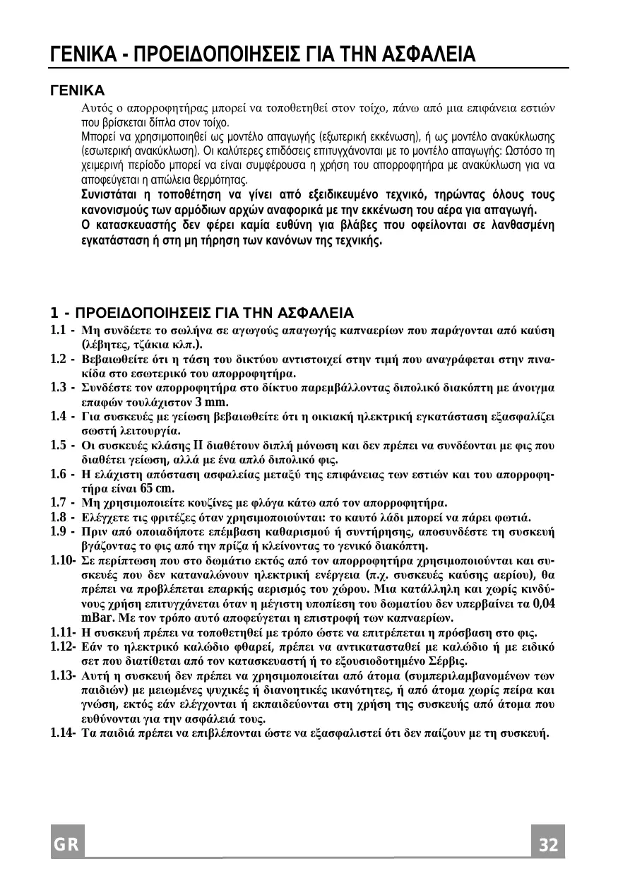 1 - ΠΡΟΕΙ∆ΟΠΟΙΗΣΕΙΣ ΓΙΑ ΤΗΝ ΑΣΦΑΛΕΙΑ 1.1 - Μη συνδέετε το σωλήνα σε αγωγούς απαγωγής καπναερίων που παράγονται από καύση (λέβητες, τζάκια κλπ.). 1.2 - Βεβαιωθείτε ότι η τάση του δικτύου αντιστοιχεί στην τιµή που αναγράφεται στην πινακίδα στο εσωτερικό του απορροφητήρα. 1.3 - Συνδέστε τον απορροφητήρα στο δίκτυο παρεµβάλλοντας διπολικό διακόπτη µε άνοιγµα επαφών τουλάχιστον 3 mm. 1.4 - Για συσκευές µε γείωση βεβαιωθείτε ότι η οικιακή ηλεκτρική εγκατάσταση εξασφαλίζει σωστή λειτουργία. 1.5 - Οι συσκευές κλάσης II διαθέτουν διπλή µόνωση και δεν πρέπει να συνδέονται µε φις που διαθέτει γείωση, αλλά µε ένα απλό διπολικό φις. 1.6 - Η ελάχιστη απόσταση ασφαλείας µεταξύ της επιφάνειας των εστιών και του απορροφητήρα είναι 65 cm. 1.7 - Μη χρησιµοποιείτε κουζίνες µε φλόγα κάτω από τον απορροφητήρα. 1.8 - Ελέγχετε τις φριτέζες όταν χρησιµοποιούνται: το καυτό λάδι µπορεί να πάρει φωτιά. 1.9 - Πριν από οποιαδήποτε επέµβαση καθαρισµού ή συντήρησης, αποσυνδέστε τη συσκευή βγάζοντας το φις από την πρίζα ή κλείνοντας το γενικό διακόπτη. 1.10- Σε περίπτωση που στο δωµάτιο εκτός από τον απορροφητήρα χρησιµοποιούνται και συσκευές που δεν καταναλώνουν ηλεκτρική ενέργεια (π.χ. συσκευές καύσης αερίου), θα πρέπει να προβλέπεται επαρκής αερισµός του χώρου. Μια κατάλληλη και χωρίς κινδύνους χρήση επιτυγχάνεται όταν η µέγιστη υποπίεση του δωµατίου δεν υπερβαίνει τα 0,04 mBar. Με τον τρόπο αυτό αποφεύγεται η επιστροφή των καπναερίων. 1.11- Η συσκευή πρέπει να τοποθετηθεί µε τρόπο ώστε να επιτρέπεται η πρόσβαση στο φις. 1.12- Εάν το ηλεκτρικό καλώδιο φθαρεί, πρέπει να αντικατασταθεί µε καλώδιο ή µε ειδικό σετ που διατίθεται από τον κατασκευαστή ή το εξουσιοδοτηµένο Σέρβις. 1.13- Αυτή η συσκευή δεν πρέπει να χρησιµοποιείται από άτοµα (συµπεριλαµβανοµένων των παιδιών) µε µειωµένες ψυχικές ή διανοητικές ικανότητες, ή από άτοµα χωρίς πείρα και γνώση, εκτός εάν ελέγχονται ή εκπαιδεύονται στη χρήση της συσκευής από άτοµα που ευθύνονται για την ασφάλειά τους. 1.14- Τα παιδιά πρέπει να επιβλέπονται ώστε να εξασφαλιστεί ότι δεν παίζουν µε τη συσκευή.
