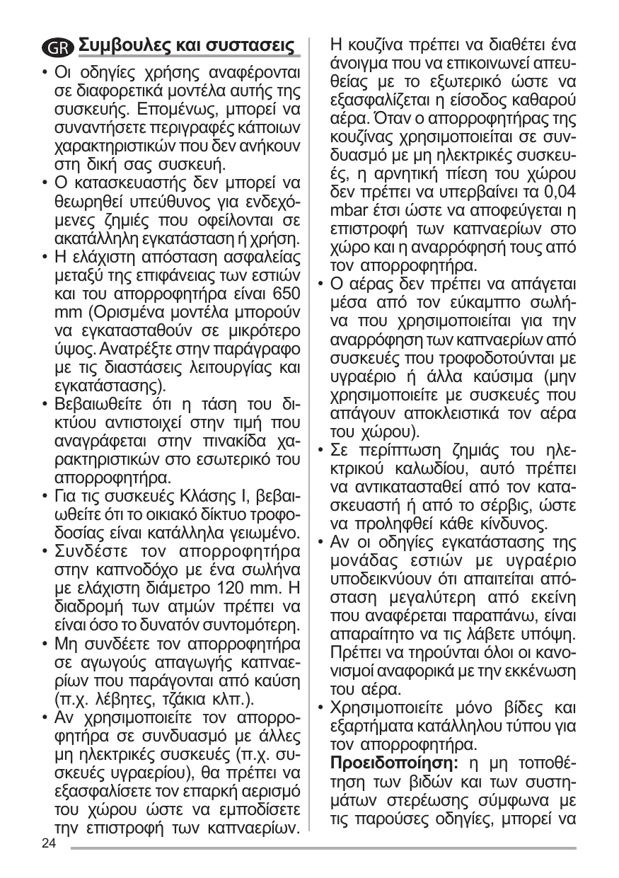 • Brancher la hotte à l’alimentation de secteur avec un interrupteur bipolaire ayant une ouverture des contacts d’au moins 3 mm.