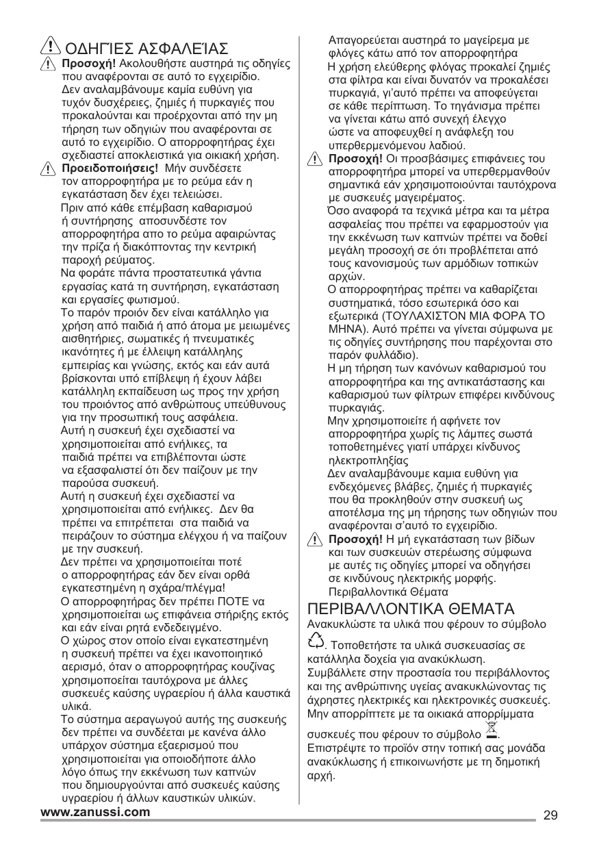 Απαγορεύεται αυστηρά το μαγείρεμα με φλόγες κάτω από τον απορροφητήρα Η χρήση ελεύθερης φλόγας προκαλεί ζημιές στα φίλτρα και είναι δυνατόν να προκαλέσει πυρκαγιά, γι’αυτό πρέπει να αποφεύγεται σε κάθε περίπτωση. Το τηγάνισμα πρέπει να γίνεται κάτω από συνεχή έλεγχο ώστε να αποφευχθεί η ανάφλεξη του υπερθερμενόμενου λαδιού. Προσοχή! Οι προσβάσιμες επιφάνειες του απορροφητήρα μπορεί να υπερθερμανθούν σημαντικά εάν χρησιμοποιούνται ταυτόχρονα με συσκευές μαγειρέματος. Όσο αναφορά τα τεχνικά μέτρα και τα μέτρα ασφαλείας που πρέπει να εφαρμοστούν για την εκκένωση των καπνών πρέπει να δοθεί μεγάλη προσοχή σε ότι προβλέπεται από τους κανονισμούς των αρμόδιων τοπικών αρχών. Ο απορροφητήρας πρέπει να καθαρίζεται συστηματικά, τόσο εσωτερικά όσο και εξωτερικά (ΤΟΥΛΑΧΙΣΤΟΝ ΜΙΑ ΦΟΡΑ ΤΟ ΜΗΝΑ). Αυτό πρέπει να γίνεται σύμφωνα με τις οδηγίες συντήρησης που παρέχονται στο παρόν φυλλάδιο). Η μη τήρηση των κανόνων καθαρισμού του απορροφητήρα και της αντικατάστασης και καθαρισμού των φίλτρων επιφέρει κινδύνους πυρκαγιάς. Μην χρησιμοποιείτε ή αφήνετε τον απορροφητήρα χωρίς τις λάμπες σωστά τοποθετημένες γιατί υπάρχει κίνδυνος ηλεκτροπληξίας Δεν αναλαμβάνουμε καμια ευθύνη για ενδεχόμενες βλάβες, ζημιές ή πυρκαγιές που θα προκληθούν στην συσκευή ως αποτέλσμα της μη τήρησης των οδηγιών που αναφέρονται σ’αυτό το εγχειρίδιο. Προσοχή! Η μή εγκατάσταση των βίδων και των συσκευών στερέωσης σύμφωνα με αυτές τις οδηγίες μπορεί να οδηγήσει σε κινδύνους ηλεκτρικής μορφής. Περιβαλλοντικά Θέματα
