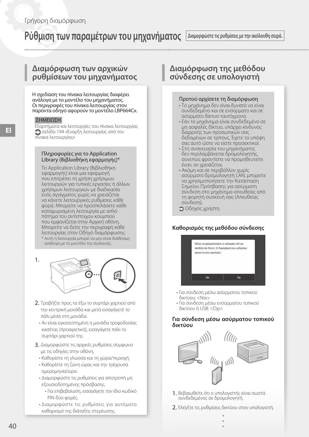 (Bibliothèque d'applications)* Application Library (Bibliothèque d'applications) vous permet d'utiliser des raccourcis associés à des boutons 1 touche pour les fonctions fréquemment utilisées, pour ne pas avoir à refaire tous les réglages correspondant à chaque utilisation de ces fonctions. Vous pouvez accéder à chaque fonction enregistrée en appuyant sur le bouton correspondant affiché sur l'écran d'accueil. Pour une description de chaque fonction, consultez le guide de configuration. Configuration de la méthode de connexion à un ordinateur Avant de commencer la configuration • Il n'est pas possible de connecter l'appareil à la fois à un réseau sans fil et à un réseau filaire. • Faites attention, si l'appareil est connecté à un réseau non sécurisé, vos données personnelles peuvent être divulguées à un tiers. • L'appareil n'est pas livré avec un routeur. Vous devez vous en procurer un. • Même dans un environnement sans routeur de réseau sans fil, vous pouvez utiliser le mode Point d'accès pour établir une connexion sans fil entre l'imprimante et votre appareil mobile (connexion directe). Guide de l'utilisateur