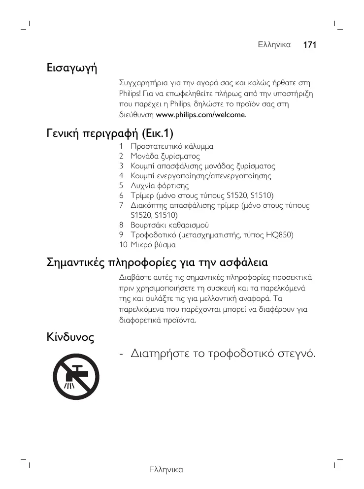 Για τη φόρτιση της μπαταρίας, χρησιμοποιείτε αποκλειστικά το αποσπώμενο τροφοδοτικό (τύπος HQ850) που παρέχεται με τη συσκευή. Το τροφοδοτικό περιλαμβάνει ένα μετασχηματιστή. Μην αφαιρέσετε το τροφοδοτικό προκειμένου να το αντικαταστήσετε με άλλο βύσμα, καθώς μπορεί να προκληθεί κίνδυνος. Αυτή η συσκευή μπορεί να χρησιμοποιηθεί από παιδιά ηλικίας 8 ετών και άνω, καθώς και από άτομα με περιορισμένες σωματικές, αισθητήριες ή διανοητικές ικανότητες ή χωρίς εμπειρία και γνώση, με την προϋπόθεση ότι τη χρησιμοποιούν υπό επίβλεψη ή έχουν λάβει οδηγίες σχετικά με την ασφαλή της χρήση και ότι κατανοούν τους ενδεχόμενους κινδύνους. Τα παιδιά δεν πρέπει να παίζουν με τη συσκευή. Ο καθαρισμός και η συντήρηση από το χρήστη δεν θα πρέπει να πραγματοποιούνται από παιδιά που δεν εποπτεύονται. Να ελέγχετε πάντα τη συσκευή πριν τη χρησιμοποιήσετε. Μη χρησιμοποιείτε τη συσκευή, εάν έχει υποστεί φθορά, καθώς μπορεί να προκληθεί τραυματισμός. Να αντικαθιστάτε πάντα τα φθαρμένα εξαρτήματα με γνήσια. Μην ανοίγετε τη συσκευή για να αντικαταστήσετε την επαναφορτιζόμενη μπαταρία.