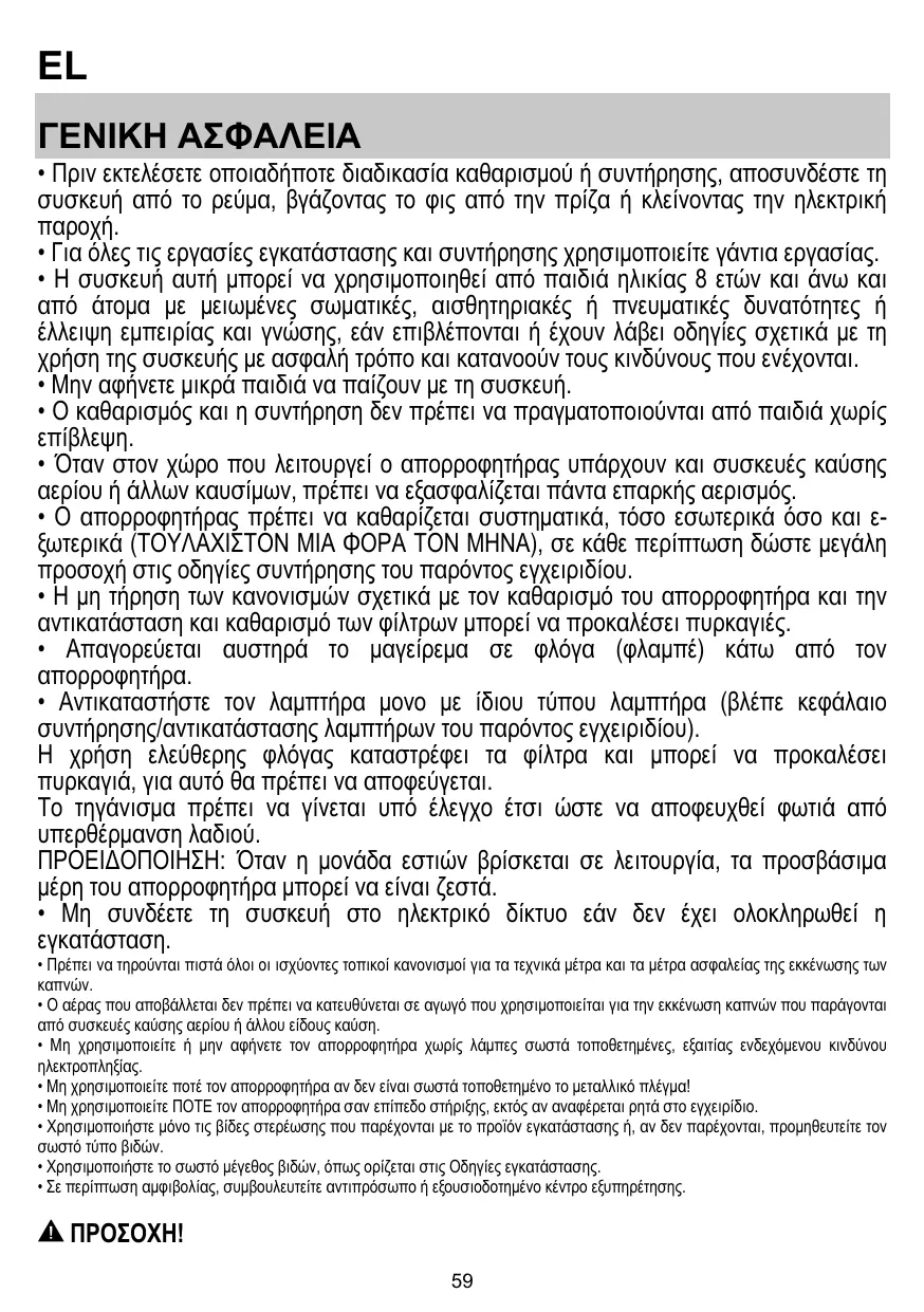 • Les enfants ne doivent pas jouer avec l’appareil. • Le nettoyage et l’entretien par l’usager ne doivent pas être effectués par des enfants sans surveillance. • La pièce doit avoir une aération suffisante lorsque la hotte est utilisée conjointement avec d'autres appareils fonctionnant au gaz ou autres combustibles. • La hotte doit être régulièrement nettoyée à la fois à l'intérieur et à l'extérieur (AU MOINS UNE FOIS PAR MOIS); cela devrait se faire en conformité avec les instructions d'entretien. Le non respect des instructions expressément fournies concernant le nettoyage de la hotte et des filtres peut provoquer des risques d'incendie. • Ne pas flamber d’aliments sous la hotte. • Pour le remplacement de la lampe, utilisez uniquement le type de lampe spécifié dans la section remplacement/maintenance lampe dans ce manuel. L'utilisation d'une flamme nue est dommageable pour les filtres et peut causer un incendie, par conséquent, il est déconseillé de l'utiliser. La friture doit être faite avec soin afin de s’assurer que l’huile surchauffée ne prenne pas feu. AVERTISSEMENT: Lorsque la table de cuisson est en fonctionnement, les parties accessibles de la hotte peuvent devenir très chaudes. • Ne pas brancher l'appareil au réseau électrique avant que l'installation ne soit complètement terminée.