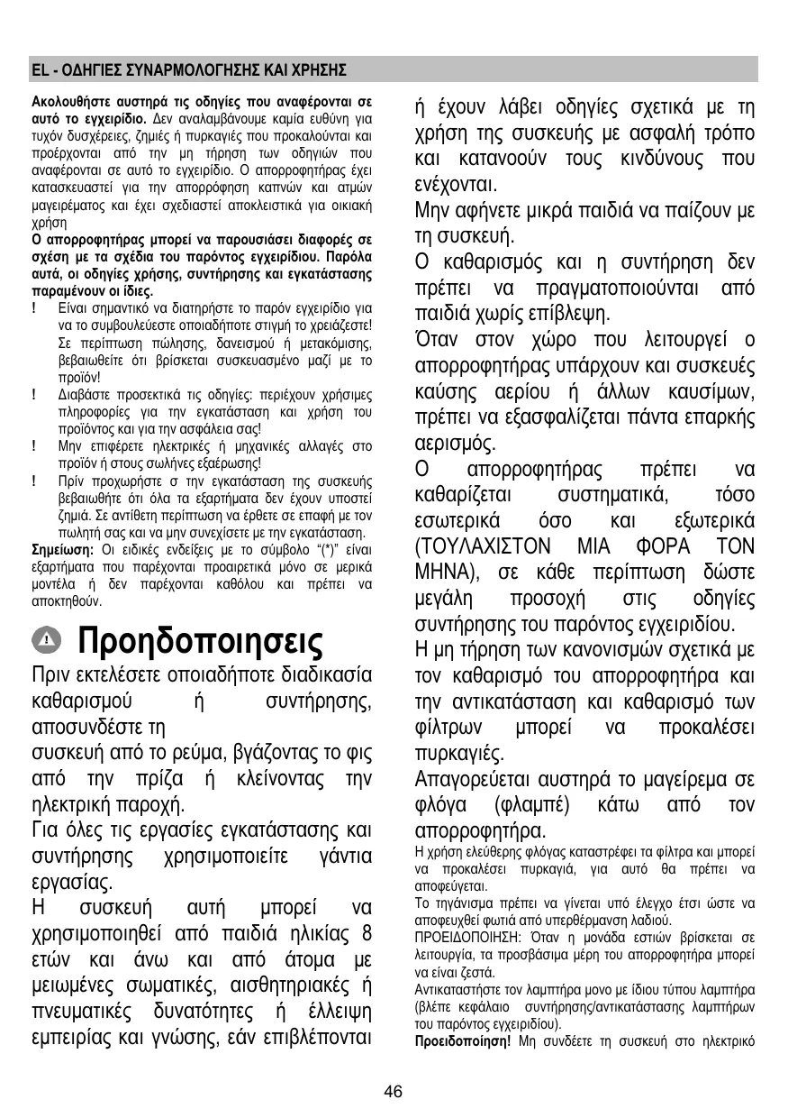 συντήρησης του παρόντος εγχειριδίου. Η μη τήρηση των κανονισμών σχετικά με τον καθαρισμό του απορροφητήρα και την αντικατάσταση και καθαρισμό των φίλτρων μπορεί να προκαλέσει Απαγορεύεται αυστηρά το μαγείρεμα σε φλόγα (φλαμπέ) κάτω από τον απορροφητήρα. Προηδοποιησεις Πριν εκτελέσετε οποιαδήποτε διαδικασία