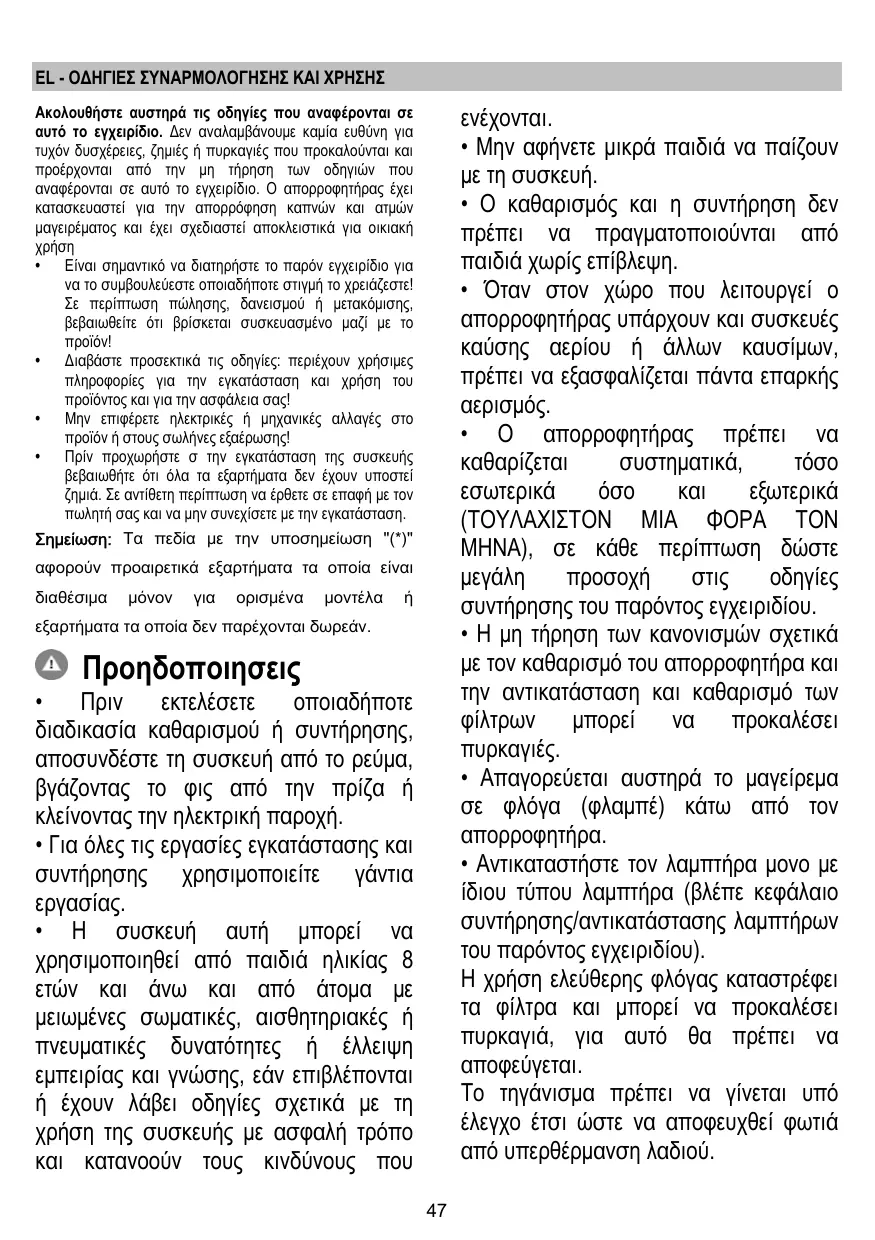 Montaje y modo de empleo Instruções para montagem e utilização Ο∆ΗΓΙΕΣ ΣΥΝΑΡΜΟΛΟΓΗΣΗΣ ΚΑΙ ΧΡΗΣΗΣ Monterings- och bruksanvisningar • Il est important de conserver ce livret pour pouvoir le consulter à tout moment. En cas de vente, de cession ou de déménagement, assurez-vous que la notice d'utilisation l'accompagne. • Veuillez lire attentivement les instructions, vous trouverez des informations importantes sur l'installation, le mode d'emploi et la sécurité. • Ne pas effectuer des modifications électriques ou mécaniques sur le produit ou sur les conduits d’évacuation. • Avant d'installer l'appareil, vérifiez qu’il n’y a aucun composant endommagé. Sinon, contactez votre revendeur et ne continuez pas l'installation. Remarque : Les pièces portant le symbole "(*)" sont des accessoires optionnels fournis uniquement avec certains modèles ou des pièces non fournies, à acheter.