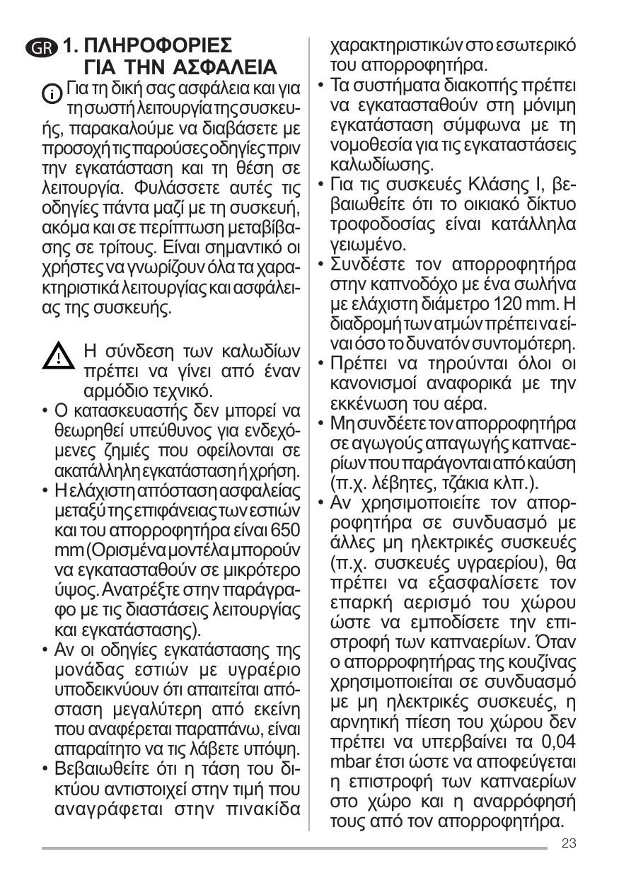 GR 1. ΠΛΗΡΟΦΟΡΙΕΣ ΓΙΑ ΤΗΝ ΑΣΦΑΛΕΙΑ Για τη δική σας ασφάλεια και για • τη σωστή λειτουργία της συσκευής, παρακαλούμε να διαβάσετε με προσοχή τις παρούσες οδηγίες πριν την εγκατάσταση και τη θέση σε λειτουργία. Φυλάσσετε αυτές τις • οδηγίες πάντα μαζί με τη συσκευή, ακόμα και σε περίπτωση μεταβίβασης σε τρίτους. Είναι σημαντικό οι χρήστες να γνωρίζουν όλα τα χαρα- • κτηριστικά λειτουργίας και ασφάλειας της συσκευής.