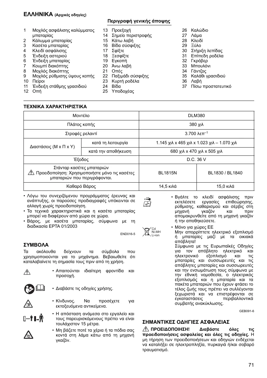 Δήλωση Συμμόρφωσης ΕΚ Η Makita δηλώνει ότι τα ακόλουθα μηχανήματα: Χαρακτηρισμός μηχανήματος: Μηχανή γκαζόν με μπαταρία Αρ. μοντέλου/ Τύπος: DLM380 Προδιαγραφές: βλ. πίνακα “ΤΕΧΝΙΚΑ ΧΑΡΑΚΤΗΡΙΣΤΙΚΑ”. συμμορφώνονται με τις ακόλουθες Ευρωπαϊκές Οδηγίες: 2000/14/ΕΚ, 2006/42/ΕΚ Κατασκευάζονται σύμφωνα με τα ακόλουθα πρότυπα ή έγγραφα τυποποίησης: EN60335 Το αρχείο τεχνικών στοιχείων, σύμφωνα με την Οδηγία 2006/42/ΕΚ, διατίθεται από: Makita International Europe Ltd. Τεχνικό Τμήμα, Michigan Drive, Tongwell, Milton Keynes, Bucks MK15 8JD, England (Αγγλία) Η απαιτούμενη διαδικασία αξιολόγησης συμμόρφωσης βάσει της Οδηγίας 2000/14/ΕΚ ήταν σύμφωνη με το Παράρτημα VI. Κοινοποιημένος φορέας: TÜV Rheinland LGA Products GmbH Tillystraße 2 90431 Nürnberg, Germany (Γερμανία) Αριθμός αναγνώρισης 0197 Στάθμη ηχητικής ισχύος μέτρησης: 93 dB (A) Εγγυημένη στάθμη ηχητικής ισχύος: 94 dB (A) 1.10.2013
