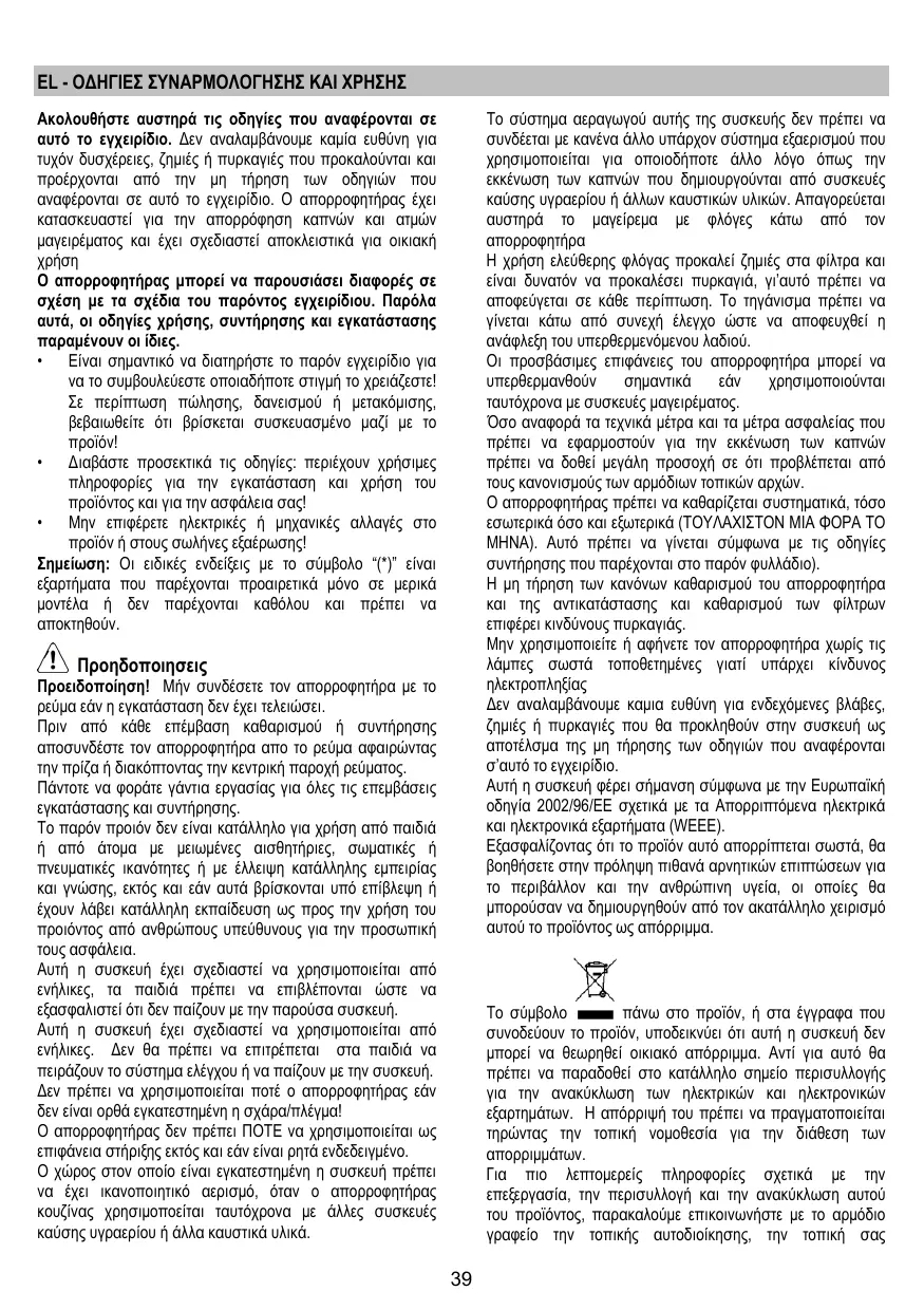 χρησιμοποιούνται ταυτόχρονα με συσκευές μαγειρέματος. Όσο αναφορά τα τεχνικά μέτρα και τα μέτρα ασφαλείας που πρέπει να εφαρμοστούν για την εκκένωση των καπνών πρέπει να δοθεί μεγάλη προσοχή σε ότι προβλέπεται από τους κανονισμούς των αρμόδιων τοπικών αρχών. Ο απορροφητήρας πρέπει να καθαρίζεται συστηματικά, τόσο εσωτερικά όσο και εξωτερικά (ΤΟΥΛΑΧΙΣΤΟΝ ΜΙΑ ΦΟΡΑ ΤΟ ΜΗΝΑ). Αυτό πρέπει να γίνεται σύμφωνα με τις οδηγίες συντήρησης που παρέχονται στο παρόν φυλλάδιο). Η μη τήρηση των κανόνων καθαρισμού του απορροφητήρα και της αντικατάστασης και καθαρισμού των φίλτρων επιφέρει κινδύνους πυρκαγιάς. Μην χρησιμοποιείτε ή αφήνετε τον απορροφητήρα χωρίς τις λάμπες σωστά τοποθετημένες γιατί υπάρχει κίνδυνος ηλεκτροπληξίας Δεν αναλαμβάνουμε καμια ευθύνη για ενδεχόμενες βλάβες, ζημιές ή πυρκαγιές που θα προκληθούν στην συσκευή ως αποτέλσμα της μη τήρησης των οδηγιών που αναφέρονται σ’αυτό το εγχειρίδιο. Αυτή η συσκευή φέρει σήμανση σύμφωνα με την Ευρωπαϊκή οδηγία 2002/96/ΕΕ σχετικά με τα Απορριπτόμενα ηλεκτρικά και ηλεκτρονικά εξαρτήματα (WEEE). Εξασφαλίζοντας ότι το προϊόν αυτό απορρίπτεται σωστά, θα βοηθήσετε στην πρόληψη πιθανά αρνητικών επιπτώσεων για το περιβάλλον και την ανθρώπινη υγεία, οι οποίες θα μπορούσαν να δημιουργηθούν από τον ακατάλληλο χειρισμό αυτού το προϊόντος ως απόρριμμα. Ακολουθήστε αυστηρά τις οδηγίες που αναφέρονται σε αυτό το εγχειρίδιο. Δεν αναλαμβάνουμε καμία ευθύνη για τυχόν δυσχέρειες, ζημιές ή πυρκαγιές που προκαλούνται και προέρχονται από την μη τήρηση των οδηγιών που αναφέρονται σε αυτό το εγχειρίδιο. Ο απορροφητήρας έχει κατασκευαστεί για την απορρόφηση καπνών και ατμών μαγειρέματος και έχει σχεδιαστεί αποκλειστικά για οικιακή Ο απορροφητήρας μπορεί να παρουσιάσει διαφορές σε σχέση με τα σχέδια του παρόντος εγχειρίδιου. Παρόλα αυτά, οι οδηγίες χρήσης, συντήρησης και εγκατάστασης παραμένουν οι ίδιες.