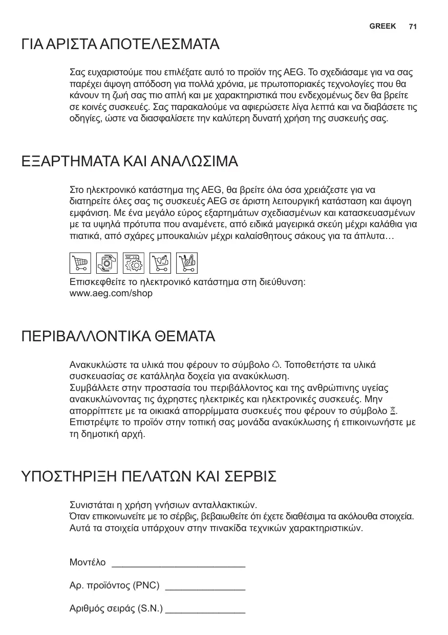 ΓΙΑ ΑΡΙΣΤΑ ΑΠΟΤΕΛΕΣΜΑΤΑ Σας ευχαριστούμε που επιλέξατε αυτό το προϊόν της AEG. Το σχεδιάσαμε για να σας παρέχει άψογη απόδοση για πολλά χρόνια, με πρωτοποριακές τεχνολογίες που θα κάνουν τη ζωή σας πιο απλή και με χαρακτηριστικά που ενδεχομένως δεν θα βρείτε σε κοινές συσκευές. Σας παρακαλούμε να αφιερώσετε λίγα λεπτά και να διαβάσετε τις οδηγίες, ώστε να διασφαλίσετε την καλύτερη δυνατή χρήση της συσκευής σας. ΕΞΑΡΤΗΜΑΤΑ ΚΑΙ ΑΝΑΛΩΣΙΜΑ Στο ηλεκτρονικό κατάστημα της AEG, θα βρείτε όλα όσα χρειάζεστε για να διατηρείτε όλες σας τις συσκευές AEG σε άριστη λειτουργική κατάσταση και άψογη εμφάνιση. Με ένα μεγάλο εύρος εξαρτημάτων σχεδιασμένων και κατασκευασμένων με τα υψηλά πρότυπα που αναμένετε, από ειδικά μαγειρικά σκεύη μέχρι καλάθια για πιατικά, από σχάρες μπουκαλιών μέχρι καλαίσθητους σάκους για τα άπλυτα… Επισκεφθείτε το ηλεκτρονικό κατάστημα στη διεύθυνση: www.aeg.com/shop ΠΕΡΙΒΑΛΛΟΝΤΙΚΑ ΘΕΜΑΤΑ Ανακυκλώστε τα υλικά που φέρουν το σύμβολο . Τοποθετήστε τα υλικά συσκευασίας σε κατάλληλα δοχεία για ανακύκλωση. Συμβάλλετε στην προστασία του περιβάλλοντος και της ανθρώπινης υγείας ανακυκλώνοντας τις άχρηστες ηλεκτρικές και ηλεκτρονικές συσκευές. Μην απορρίπτετε με τα οικιακά απορρίμματα συσκευές που φέρουν το σύμβολο . Επιστρέψτε το προϊόν στην τοπική σας μονάδα ανακύκλωσης ή επικοινωνήστε με τη δημοτική αρχή. ΥΠΟΣΤΗΡΙΞΗ ΠΕΛΑΤΩΝ ΚΑΙ ΣΕΡΒΙΣ Συνιστάται η χρήση γνήσιων ανταλλακτικών. Όταν επικοινωνείτε με το σέρβις, βεβαιωθείτε ότι έχετε διαθέσιμα τα ακόλουθα στοιχεία. Αυτά τα στοιχεία υπάρχουν στην πινακίδα τεχνικών χαρακτηριστικών. Μοντέλο __________________________ Αρ. προϊόντος (PNC) ________________ Αριθμός σειράς (S.N.) _______________ 72 www.aeg.com