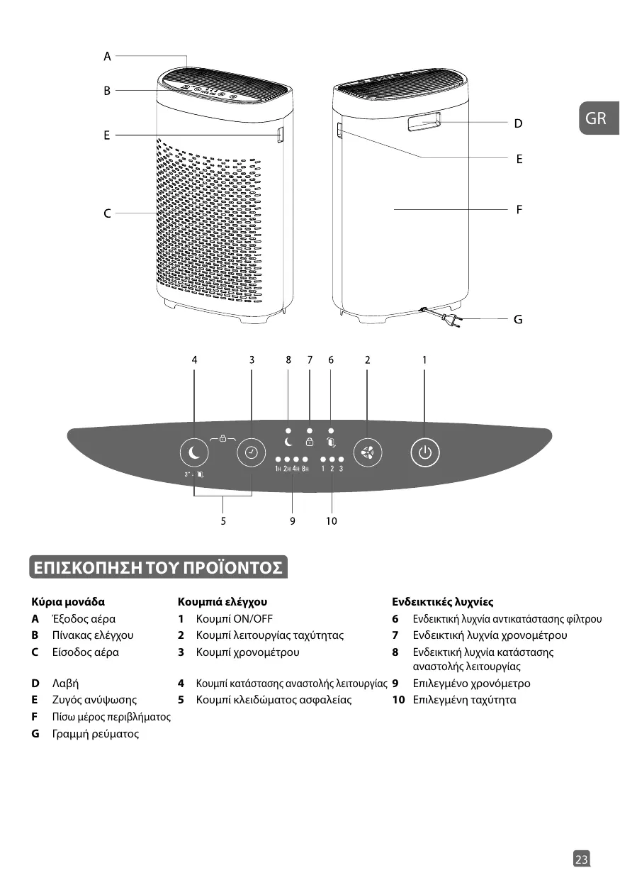 6 Indicateur de remplacement de filtre 7 Indicateur du minuteur 8 Indicateur de mode veille 9 Minuteur sélectionné 10 Vitesse sélectionnée • Pour votre sécurité, cet appareil est conforme aux normes et réglementations en vigueur (basse tension, compatibilité électromagnétique, directives environnementales, etc.). • Cet appareil ne doit pas être utilisé par des personnes (y compris les enfants) ayant des capacités physiques, sensorielles ou mentales réduites, ou un manque d'expérience et de connaissances, à moins qu'elles ne soient encadrées ou qu'elles n'aient reçu au préalable des instructions quant à son utilisation par une personne responsable de leur sécurité. • Les enfants doivent être surveillés pour s’assurer qu’ils ne jouent pas avec l’appareil. • L'appareil peut être utilisé par des enfants âgés de 8 ans et plus et des personnes manquant d'expérience ou de connaissances ou ayant des capacités physiques, sensorielles ou mentales réduites, à condition qu'elles soient encadrées, qu'elles aient appris à utiliser l'appareil en toute sécurité et qu'elles soient conscientes des risques encourus. Les enfants ne doivent pas jouer avec l’appareil. • Si le câble d’alimentation est endommagé, il doit être remplacé par le fabricant, son service après-vente ou des personnes de qualification similaire afin d’éviter tout danger. • Les enfants ne doivent pas nettoyer l'appareil ni effectuer d'entretien sans être surveillés. • Pour les opérations d'entretien, veuillez consulter la section « Entretien ». • Conservez l’appareil et son câble d’alimentation hors de portée des enfants âgés de moins de 8 ans. 10