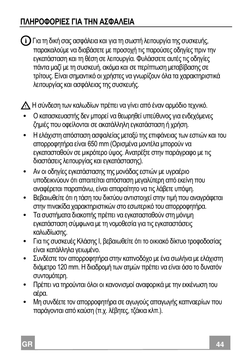 Η σύνδεση των καλωδίων πρέπει να γίνει από έναν αρµόδιο τεχνικό. Ο κατασκευαστής δεν µπορεί να θεωρηθεί υπεύθυνος για ενδεχόµενες ζηµιές που οφείλονται σε ακατάλληλη εγκατάσταση ή χρήση. Η ελάχιστη απόσταση ασφαλείας µεταξύ της επιφάνειας των εστιών και του απορροφητήρα είναι 650 mm (Ορισµένα µοντέλα µπορούν να εγκατασταθούν σε µικρότερο ύψος. Ανατρέξτε στην παράγραφο µε τις διαστάσεις λειτουργίας και εγκατάστασης). Αν οι οδηγίες εγκατάστασης της µονάδας εστιών µε υγραέριο υποδεικνύουν ότι απαιτείται απόσταση µεγαλύτερη από εκείνη που αναφέρεται παραπάνω, είναι απαραίτητο να τις λάβετε υπόψη. Βεβαιωθείτε ότι η τάση του δικτύου αντιστοιχεί στην τιµή που αναγράφεται στην πινακίδα χαρακτηριστικών στο εσωτερικό του απορροφητήρα. Τα συστήµατα διακοπής πρέπει να εγκατασταθούν στη µόνιµη εγκατάσταση σύµφωνα µε τη νοµοθεσία για τις εγκαταστάσεις καλωδίωσης. Για τις συσκευές Κλάσης Ι, βεβαιωθείτε ότι το οικιακό δίκτυο τροφοδοσίας είναι κατάλληλα γειωµένο. Συνδέστε τον απορροφητήρα στην καπνοδόχο µε ένα σωλήνα µε ελάχιστη διάµετρο 120 mm. Η διαδροµή των ατµών πρέπει να είναι όσο το δυνατόν συντοµότερη. Πρέπει να τηρούνται όλοι οι κανονισµοί αναφορικά µε την εκκένωση του Μη συνδέετε τον απορροφητήρα σε αγωγούς απαγωγής καπναερίων που παράγονται από καύση (π.χ. λέβητες, τζάκια κλπ.).