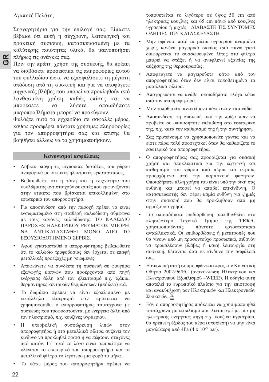 Ne jamais laisser les brûleurs à gaz allumés sans placer un récipient dessus. La graisse accumulée dans les filtres peut dégoutter ou s'enflammer à cause de l'augmentation de température. Éviter de faire la cuisine sous la hotte si les filtres métalliques ne se trouvent pas à leur place, par exemple; pendant qu'ils sont nettoyés dans le lave-vaisselle. Il est interdit de flamber sous la hotte. Ne mettez pas d´objets au-dessus la hotte. Débrancher l'appareil avant de faire n'importe quelle manipulation à l'intérieur de ce dernier ; par exemple, pendant le nettoyage ou l'entretien. Nous vous recommandons d'utiliser des gants et de prendre toutes les précautions nécessaires au moment de nettoyer l'intérieur de la hotte. La hotte est destinée à l'usage domestique et exclusivement à l'extraction et à la purification des gaz produits par la préparation d'aliments. L'utilisation à d'autres fins est sous votre entière responsabilité et peut être dangereuse. Le fabricant ne se responsabilise pas des dommages causés par une mauvaise utilisation de l'appareil. Pour tout type de réparation, veuillez vous adresser au Service d'Assistance Technique de TEKA le plus proche, et utiliser toujours des pièces de rechange originales. Les réparations ou modifications réalisées par un personnel non qualifié peuvent causer des dommages à l'appareil ou peuvent entraîner un mauvais fonctionnement et peuvent même mettre en danger votre propre sécurité. Cet appareil respecte la directive européenne 2002/96/CE relative aux appareils électriques et électroniques usagés “Waste Electrical and Electronic Equipment” (WEEE). La directive définit le cadre pour une reprise et une récupération des appareils usagés applicables dans les pays de la CE, . Lorsqu´on met en marche la hotte en même temps que d´autres appareils alimentés par une énergie autre qu´électrique, la sortie d´air ne doit pas être supérieure à 4Pa (4 x 10-5 bar).