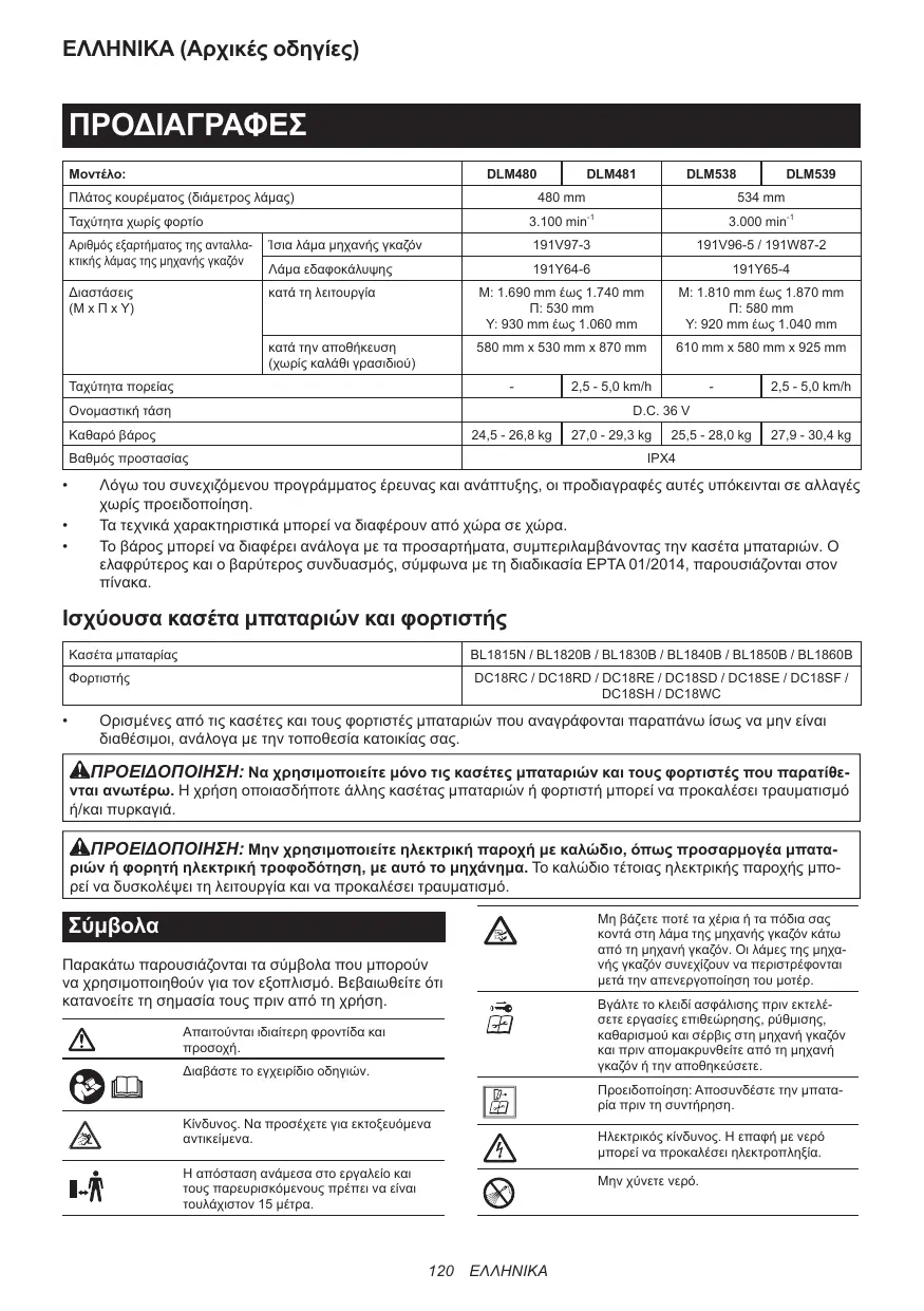 ΠΡΟΕΙΔΟΠΟΙΗΣΗ: Να χρησιμοποιείτε μόνο τις κασέτες μπαταρι ν και τους φορτιστές που παρατίθενται ανωτέρω. Η χρήση οποιασδήποτε άλλης κασέτας μπαταριών ή φορτιστή μπορεί να προκαλέσει τραυματισμό ή/και πυρκαγιά. ΠΡΟΕΙΔΟΠΟΙΗΣΗ: Μην χρησιμοποιείτε ηλεκτρική παροχή με καλ ιο, όπως προσαρμογέα μπαταρι ν ή φορητή ηλεκτρική τροφο ότηση, με αυτό το μηχάνημα. Το καλώδιο τέτοιας ηλεκτρικής παροχής μπορεί να δυσκολέψει τη λειτουργία και να προκαλέσει τραυματισμό. Μη βάζετε ποτέ τα χέρια ή τα πόδια σας κοντά στη λάμα της μηχανής γκαζόν κάτω από τη μηχανή γκαζόν. Οι λάμες της μηχανής γκαζόν συνεχίζουν να περιστρέφονται μετά την απενεργοποίηση του μοτέρ.
