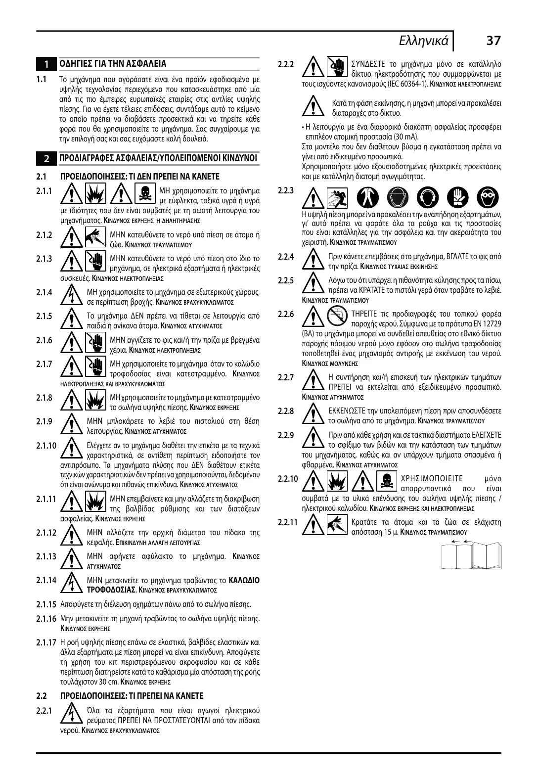 Intervention soupape de sûreté à décharge libre Température de l’eau trop élevée Contrôler les raccords Éteindre l’appareil et actionner le pistolet jusqu’à la sortie d’un jet continu. Rallumer. Tourner la tête (E) (+) (fig.3) Attendre le rétablissement de la température correcte de l’eau Raccorder l’appareil au réseau d’alimentation en eau Baisser la température Nettoyer la buse (fig.5) Nettoyer le filtre (L) (fig.5) Contrôler que la tension de réseau corresponde à celle de la plaque (fig.2) Vérifier les caractéristiques de la rallonge Contacter le Centre d’assistance technique agréé Contacter le Centre d’assistance technique agréé Vérifier la présence de tension dans le réseau et contrôler si la fiche est bien introduite dans la prise (*) Contacter le Centre d’assistance technique agréé Par le trou arrière, débloquer le moteur avec l’outil (M) (pour les modèles qui le prévoient) (fig.5) Remplacer les joints auprès d’un Centre d’assistance technique agréé Contacter le Centre d’assistance technique agréé Baisser la température (voir données techniques) Contacter le Centre d’assistance technique agréé