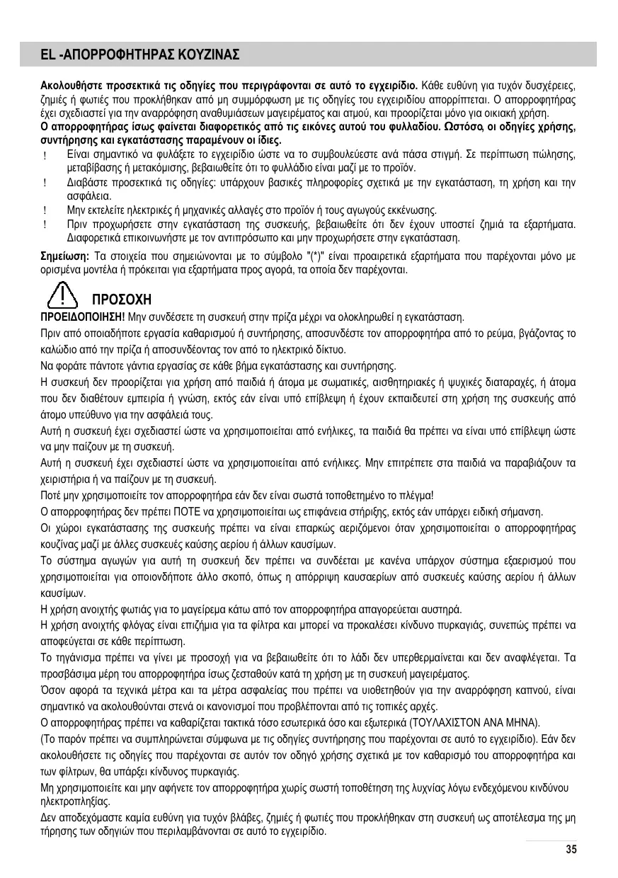 EL -ΑΠΟΡΡΟΦΗΤΗΡΑΣ ΚΟΥΖΙΝΑΣ Ακολουθήστε προσεκτικά τις οδηγίες που περιγράφονται σε αυτό το εγχειρίδιο. Κάθε ευθύνη για τυχόν δυσχέρειες, ζημιές ή φωτιές που προκλήθηκαν από μη συμμόρφωση με τις οδηγίες του εγχειριδίου απορρίπτεται. Ο απορροφητήρας έχει σχεδιαστεί για την αναρρόφηση αναθυμιάσεων μαγειρέματος και ατμού, και προορίζεται μόνο για οικιακή χρήση. Ο απορροφητήρας ίσως φαίνεται διαφορετικός από τις εικόνες αυτού του φυλλαδίου. Ωστόσο, οι οδηγίες χρήσης, συντήρησης και εγκατάστασης παραμένουν οι ίδιες. ! Είναι σημαντικό να φυλάξετε το εγχειρίδιο ώστε να το συμβουλεύεστε ανά πάσα στιγμή. Σε περίπτωση πώλησης, μεταβίβασης ή μετακόμισης, βεβαιωθείτε ότι το φυλλάδιο είναι μαζί με το προϊόν. ! Διαβάστε προσεκτικά τις οδηγίες: υπάρχουν βασικές πληροφορίες σχετικά με την εγκατάσταση, τη χρήση και την ασφάλεια. ! Μην εκτελείτε ηλεκτρικές ή μηχανικές αλλαγές στο προϊόν ή τους αγωγούς εκκένωσης. ! Πριν προχωρήσετε στην εγκατάσταση της συσκευής, βεβαιωθείτε ότι δεν έχουν υποστεί ζημιά τα εξαρτήματα. Διαφορετικά επικοινωνήστε με τον αντιπρόσωπο και μην προχωρήσετε στην εγκατάσταση. Σημείωση: Τα στοιχεία που σημειώνονται με το σύμβολο "(*)" είναι προαιρετικά εξαρτήματα που παρέχονται μόνο με ορισμένα μοντέλα ή πρόκειται για εξαρτήματα προς αγορά, τα οποία δεν παρέχονται.