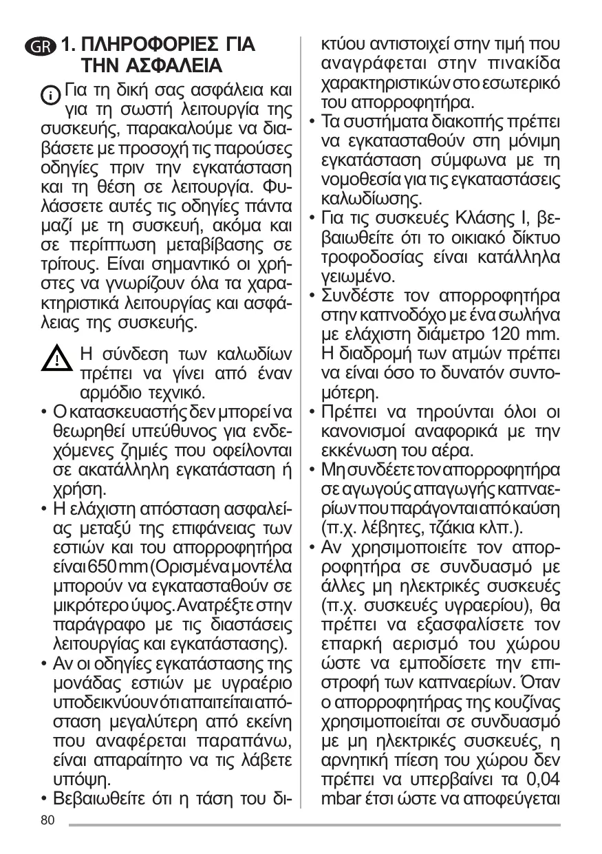 Les dispositifs de sectionnement doivent être montés dans l’installation fixe conformément aux normes sur les systèmes de câblage. Pour les appareils de Classe I, s’assurer que l’installation électrique de votre intérieur dispose d’une mise à la terre adéquate. Reliez l’aspirateur du conduit de cheminée avec un tube ayant un diamètre minimum de 120 mm. Le parcours des fumées doit être le plus court possible. Respecter toutes les normes concernant l’évacuation de l’air. Ne reliez pas la hotte aspirante aux conduits de cheminée qui acheminent les fumées de combustion (par ex. de chaudières, de cheminées, etc.). Si vous utilisez l’aspirateur en même temps que des appareils non électriques (par ex. fonctionnant au gaz), veillez à ce que la pièce soit adéquatement ventilée, afin d’empêcher le retour du flux des gaz d’évacuation. Si vous utilisez la hotte de cuisine en même temps que des appareils non alimentés à l’électricité, la pression négative dans la pièce ne doit pas dépasser 0,04 mbar, afin d’éviter que les fumées soient réaspirées dans la pièce où se trouve la hotte.