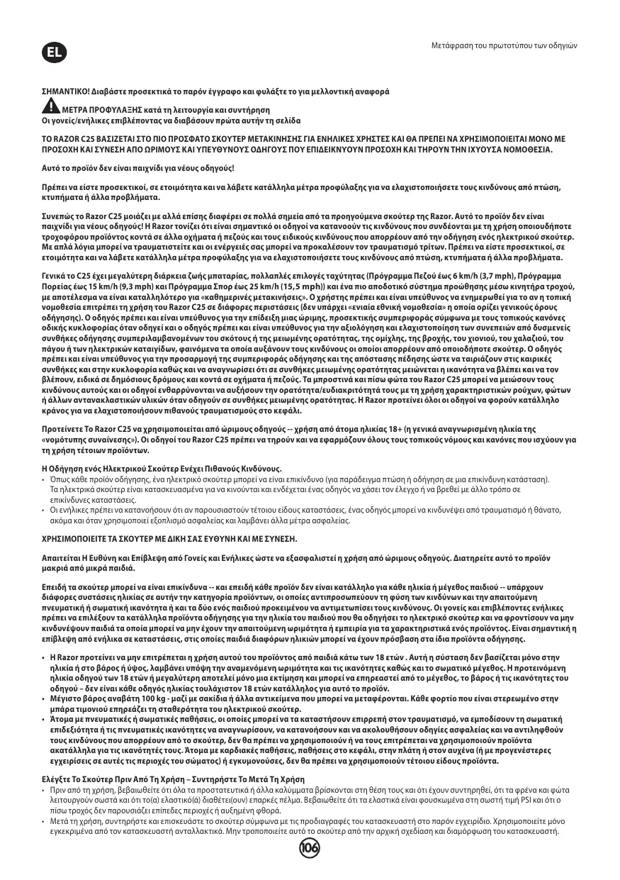 Ce produit n’est pas un jouet pour jeunes utilisateurs ! Vous devez être prudent, attentif et prendre des précautions raisonnables pour réduire au minimum les risques de chute, d’accident ou autres problèmes. Le Razor C25 est donc nécessairement à la fois comparable, mais par beaucoup d’aspects, différent des précédents scooters Razor. Ce produit n’est pas un jouet pour jeunes utilisateurs ! Razor souligne donc l’importance pour les utilisateurs de bien comprendre les risques associés à l’utilisation de quasiment tout produit à roues près de la circulation des véhicules ou des piétons ainsi que les risques spécifiques à conduire un scooter électrique. Pour le dire brutalement, vous pourriez être blessé et vos actions pourraient causer des blessures à d’autres. Vous devez être prudent, attentif et prendre des précautions raisonnables pour réduire au minimum les risques de chute, d’accident ou autres problèmes. Pour l’essentiel, le Razor C25 a une autonomie sur batterie supérieure, plusieurs options de vitesse (Mode piéton jusqu’à 6 km/h, Mode croisière jusqu’à 15 km/h (9,3 mph) et Mode sport jusqu’à 25 km/h (15,5 mph)), et un système de propulsion à moteur dans le moyeu plus efficace qui le destine plus aux usages de « trajet domicile-travail ». L’utilisateur doit être et est de toute façon responsable de la vérification de la possibilité d’utiliser le Razor C25 dans diverses circonstances d’après les lois locales (il n’y a pas de « loi internationale uniforme » actuellement pour définir des conditions d’utilisation universelles). Le conducteur doit être et est de toute façon responsable d’agir de façon raisonnée, prudente et dans le respect des règles du code de la route local pendant la conduite, et ce conducteur doit être et est de toute façon responsable de l’évaluation et de la prise en compte des conditions de conduite potentiellement néfastes, notamment conditions d’éclairage ou de visibilité insuffisantes, brouillard, pluie, neige, grêle, verglas ou orages à éclairs, qui augmentent les dangers inhérents à l’utilisation de tout scooter. Le conducteur doit être et est de toute façon responsable de l’ajustement de son comportement de conduite et de sa distance de freinage en fonction des conditions météorologiques et de circulation, ainsi que de prendre en compte la diminution des possibilités de voir et être vu par faible visibilité, en particulier sur route publique et près de véhicules ou de piétons. Les feux avant et arrière du Razor C25 peuvent réduire ces risques, et les utilisateurs sont aussi encouragés à améliorer leur visibilité ou leur signalisation par des vêtements à haute visibilité, des feux ou autres éléments réfléchissants pour conduire par visibilité réduite. Razor recommande aussi absolument à tout utilisateur de porter un casque approprié pour limiter les blessures potentielles à la tête. L’utilisation du scooter Razor C25 est recommandée aux conducteurs adultes -- avec un âge conseillé de plus de 18 ans (généralement considéré comme un âge de « consentement juridique »). Les utilisateurs du Razor C25 doivent assurément respecter et adopter toutes les lois et règles applicables localement à l’utilisation de ces produits. L’utilisation d’une trottinette électrique présente des risques potentiels. • Comme tout autre produit mobile, une trottinette électrique peut être dangereuse (par exemple, on peut tomber ou être confronté à une situation dangereuse). Il va de soi que les trottinettes électriques sont conçues pour se déplacer; il est donc possible que l’utilisateur perde la maîtrise ou soit confronté à des situations dangereuses. • Les utilisateurs doivent comprendre que si une telle situation se présente, un utilisateur peut subir des blessures graves, voire mortelles, même s’il utilise l’équipement de sécurité et qu’il respecte les autres précautions de sécurité. UTILISER LES TROTTINETTES À VOS PROPRES RISQUES ET FAIRE PREUVE DE BON SENS. La présence d’un parent ou d’un adulte responsable est indispensable pour s’assurer de l’utilisation par des conducteurs novices. Conserver ce produit hors de portée des enfants. Parce que les trottinettes peuvent être dangereuses et que tout produit n’est pas approprié aux enfants de tout âge ou de toute taille, il existe différentes recommandations relatives à l’âge dans cette catégorie de produits, qui ont pour but de refléter la nature des dangers et les capacités physiques ou mentales prévues, ou les deux, qu’un enfant possède pour faire face aux dangers. Les parents et les adultes chargés de surveiller les enfants doivent choisir des produits mobiles adaptés à l’âge de l’enfant qui utilisera la trottinette électrique et prendre les précautions afin d’éviter que les enfants trop immatures ou inexpérimentés pour les caractéristiques d’un produit se mettent en danger. Une supervision par les parents est essentielle quand des enfants d’âge différent peuvent avoir accès à ces produits. • La société Razor recommande que l’usage de ce produit ne soit pas permis aux enfants âgés de moins de 18 ans. Cette recommandation est fondée non, tout simplement, sur l’âge, le poids ou la taille ; mais elle reflète la prise en compte de la maturité attendue ainsi que l’aspect physique. L’âge recommandé de 18 ans ou plus est seulement une estimation, et il peut être affecté par la taille, le poids ou les capacités de l’utilisateur. - ce produit ne sera pas considéré comme convenant, d’emblée, pour chaque enfant âgé de 18 ans. • Poids maximal du conducteur 100 kg – y compris sacs à dos et autres articles pouvant être transportés. Toute charge fixée au guidon dégrade la stabilité du scooter électrique. • Toute personne présentant des problèmes mentaux ou physiques 