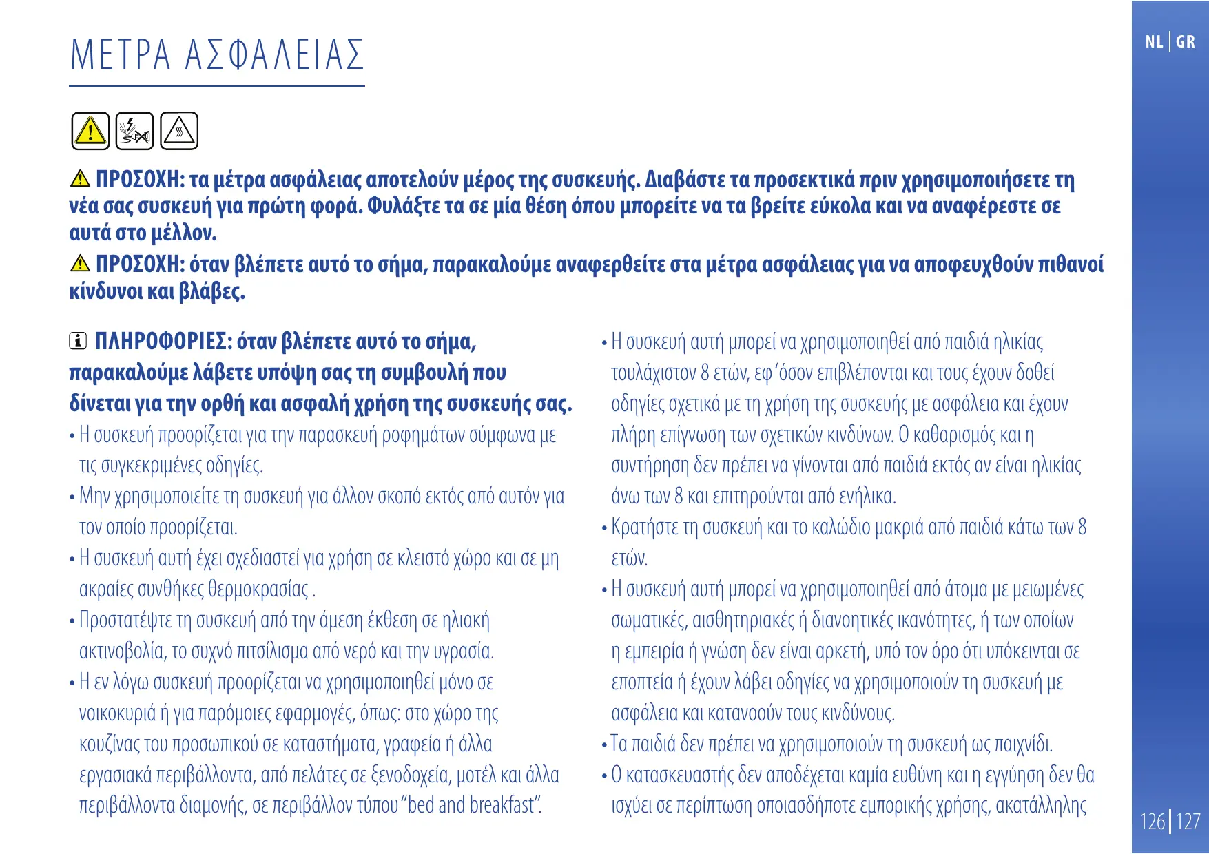ΜΕΤΡΑ ΑΣΦΑΛΕΙΑΣ ΠΡΟΣΟΧΗ: τα μέτρα ασφάλειας αποτελούν μέρος της συσκευής. Διαβάστε τα προσεκτικά πριν χρησιμοποιήσετε τη νέα σας συσκευή για πρώτη φορά. Φυλάξτε τα σε μία θέση όπου μπορείτε να τα βρείτε εύκολα και να αναφέρεστε σε αυτά στο μέλλον. ΠΡΟΣΟΧΗ: όταν βλέπετε αυτό το σήμα, παρακαλούμε αναφερθείτε στα μέτρα ασφάλειας για να αποφευχθούν πιθανοί κίνδυνοι και βλάβες. ΠΛΗΡΟΦΟΡΙΕΣ: όταν βλέπετε αυτό το σήμα, παρακαλούμε λάβετε υπόψη σας τη συμβουλή που δίνεται για την ορθή και ασφαλή χρήση της συσκευής σας. rȚɅɇɅȾȹɇɏƂɄɃɃɄɐȺȹɆȵȽȷȽȵɆȻɁƂȵɄȵɅȾȹɇɏɄɃɈȻɀɍɆɋɁɅɓɀɈɋɁȵɀȹ τις συγκεκριμένες οδηγίες. rȟȻɁɉɄȻɅȽɀɃƂɃȽȹɐɆȹɆȻɅɇɅȾȹɇɏȷȽȵɍȿȿɃɁɅȾɃƂɒȹȾɆɒɌȵƂɒȵɇɆɒɁȷȽȵ τον οποίο προορίζεται. rȚɅɇɅȾȹɇɏȵɇɆɏɎɉȹȽɅɉȹȸȽȵɅɆȹɐȷȽȵɉɄɏɅȻɅȹȾȿȹȽɅɆɒɉɕɄɃȾȵȽɅȹɀȻ ακραίες συνθήκες θερμοκρασίας . rȣɄɃɅɆȵɆɎɊɆȹɆȻɅɇɅȾȹɇɏȵƂɒɆȻɁɍɀȹɅȻɎȾȼȹɅȻɅȹȻȿȽȵȾɏ ακτινοβολία, το συχνό πιτσίλισμα από νερό και την υγρασία. rȚȹɁȿɒȷɋɅɇɅȾȹɇɏƂɄɃɃɄɐȺȹɆȵȽɁȵɉɄȻɅȽɀɃƂɃȽȻȼȹɐɀɒɁɃɅȹ νοικοκυριά ή για παρόμοιες εφαρμογές, όπως: στο χώρο της κουζίνας του προσωπικού σε καταστήματα, γραφεία ή άλλα εργασιακά περιβάλλοντα, από πελάτες σε ξενοδοχεία, μοτέλ και άλλα περιβάλλοντα διαμονής, σε περιβάλλον τύπου “bed and breakfast”.
